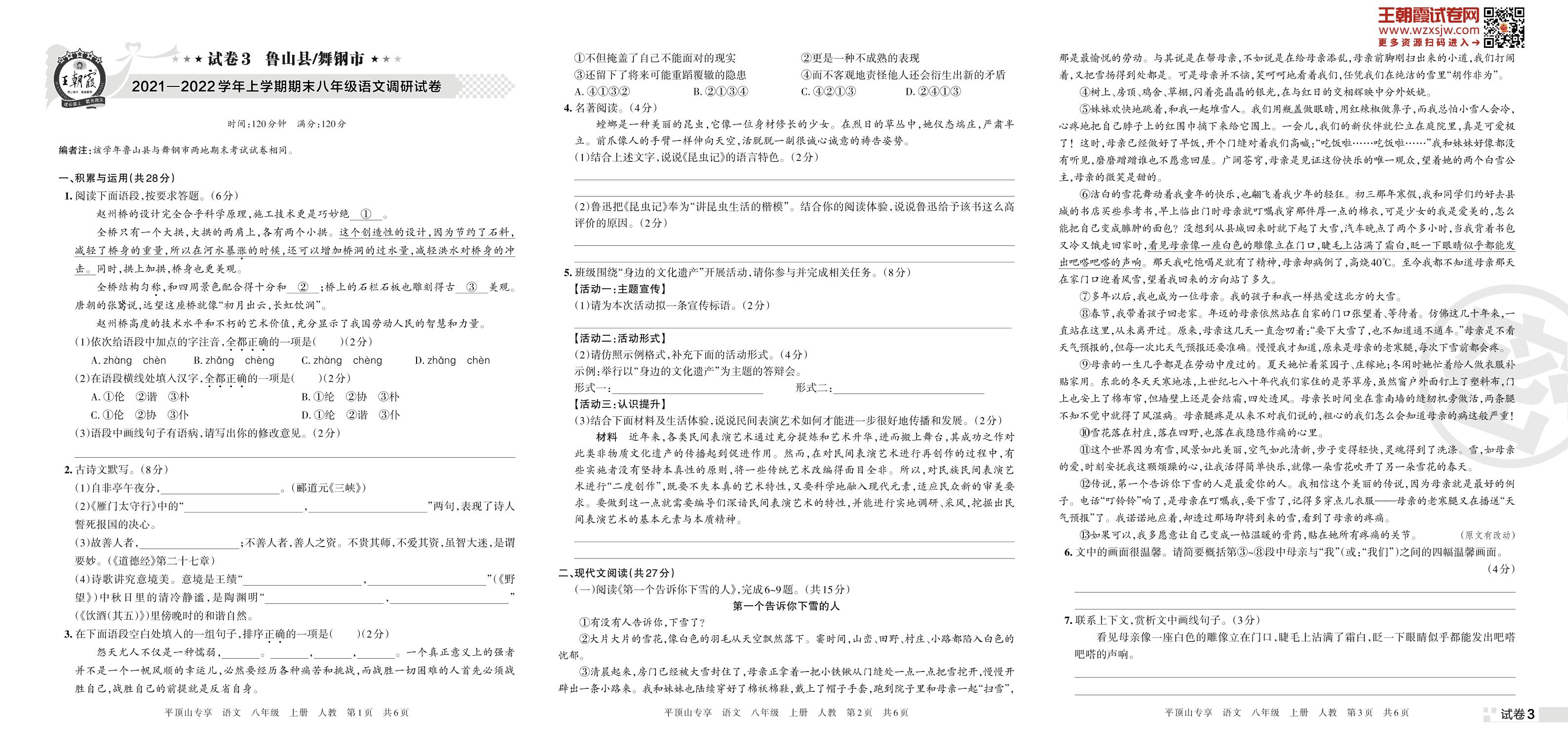 鲁山县、舞钢市2021—2022学年上学期期末八年级语文调研试卷(人教版)【3】
