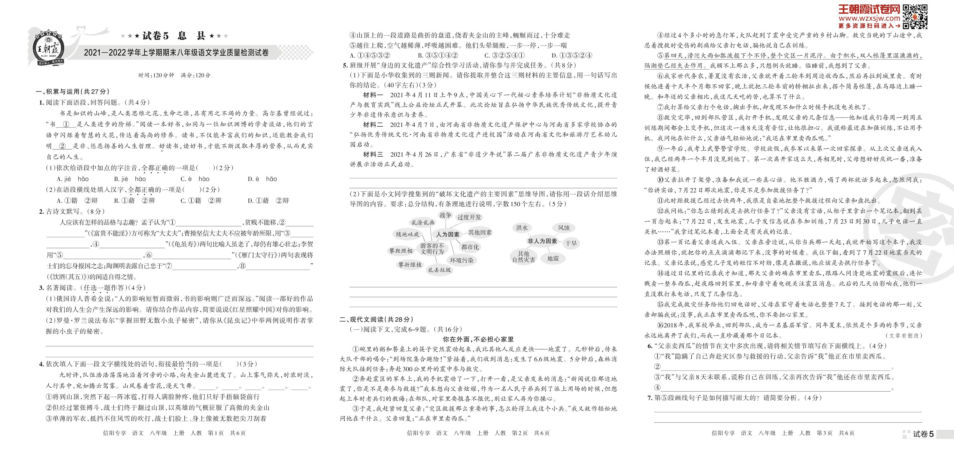息县2021—2022学年上学期期末八年级语文学业质量检测试卷(人教版)【5】