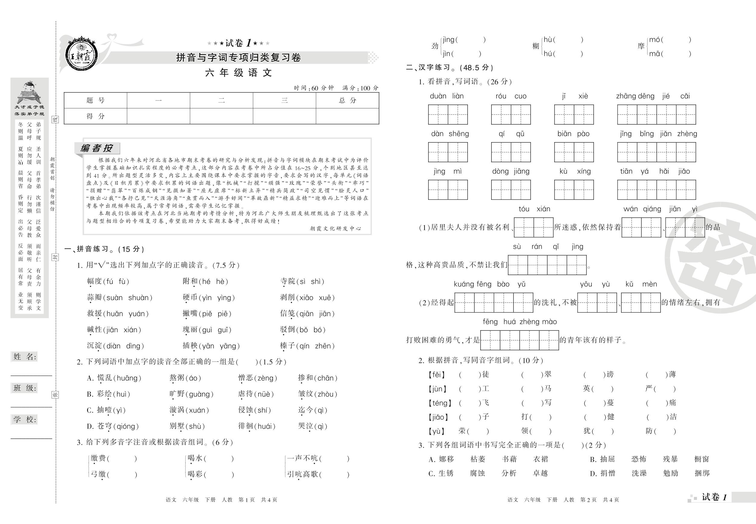 王朝霞期末专项卷——拼音与字词专项归类复习卷六年级下册语文(人教版)_R210802121159【1】