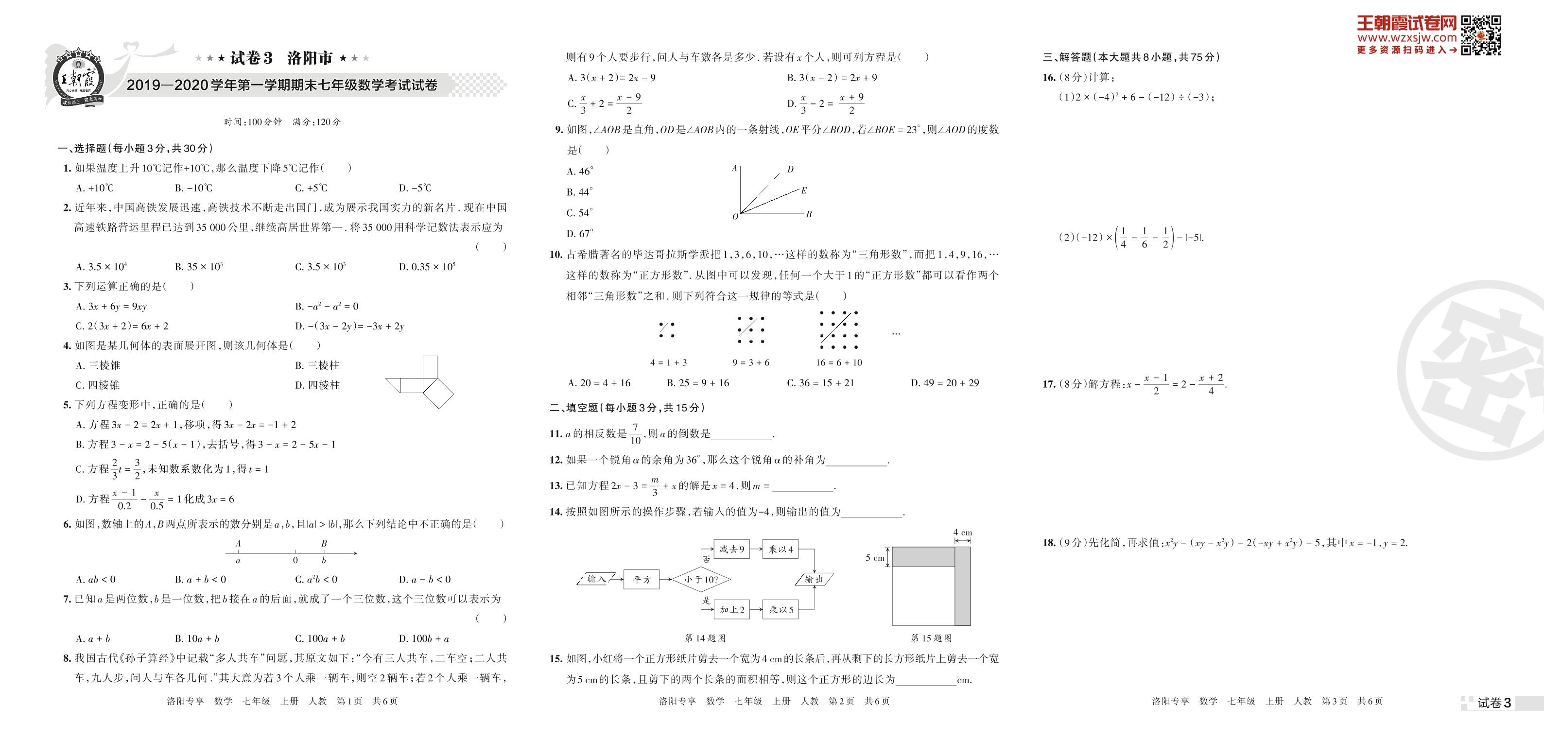 洛阳市2019—2020学年第一学期期末七年级数学考试试卷(人教版)【3】