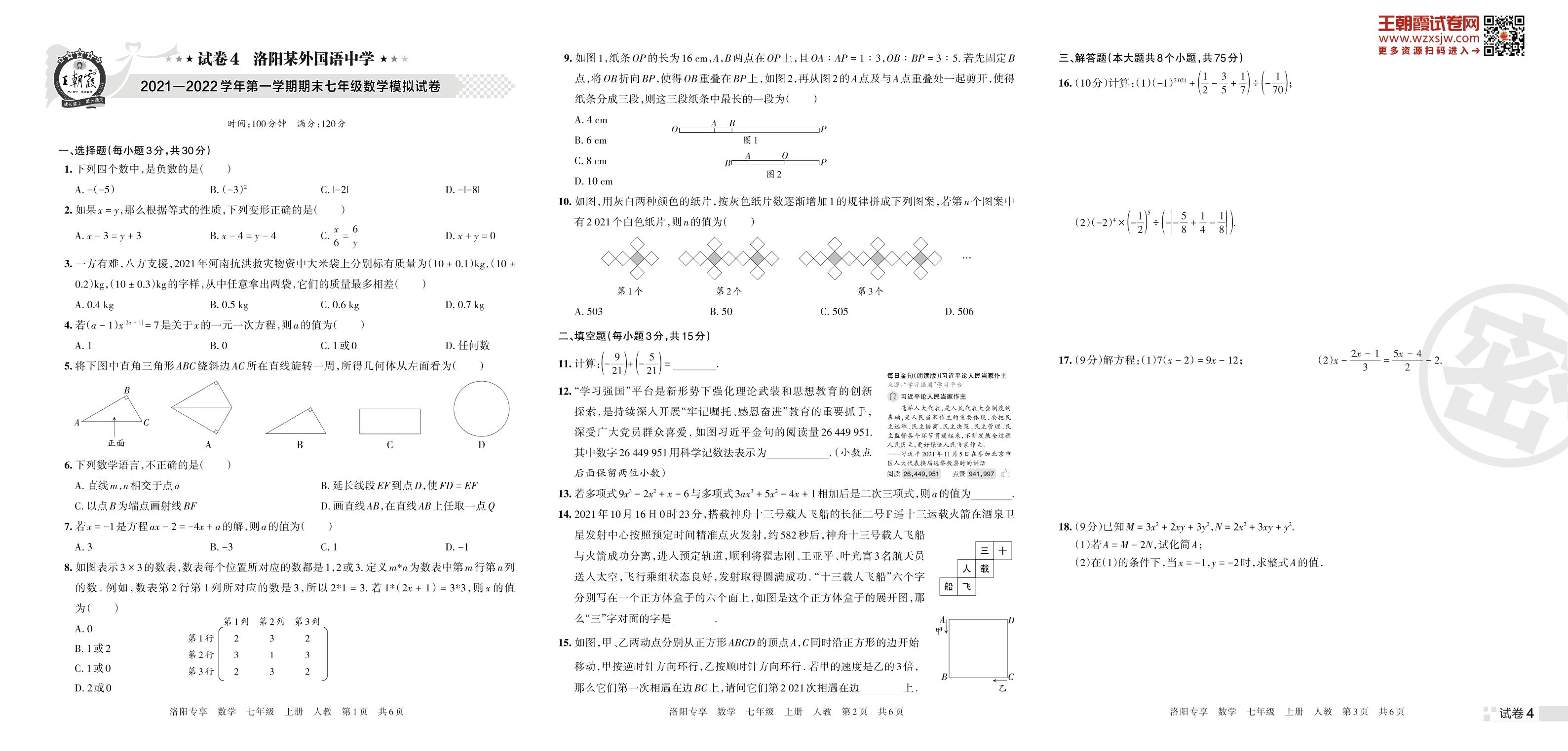 洛阳某外国语中学2021—2022学年第一学期期末七年级数学模拟试卷(人教版)【4】