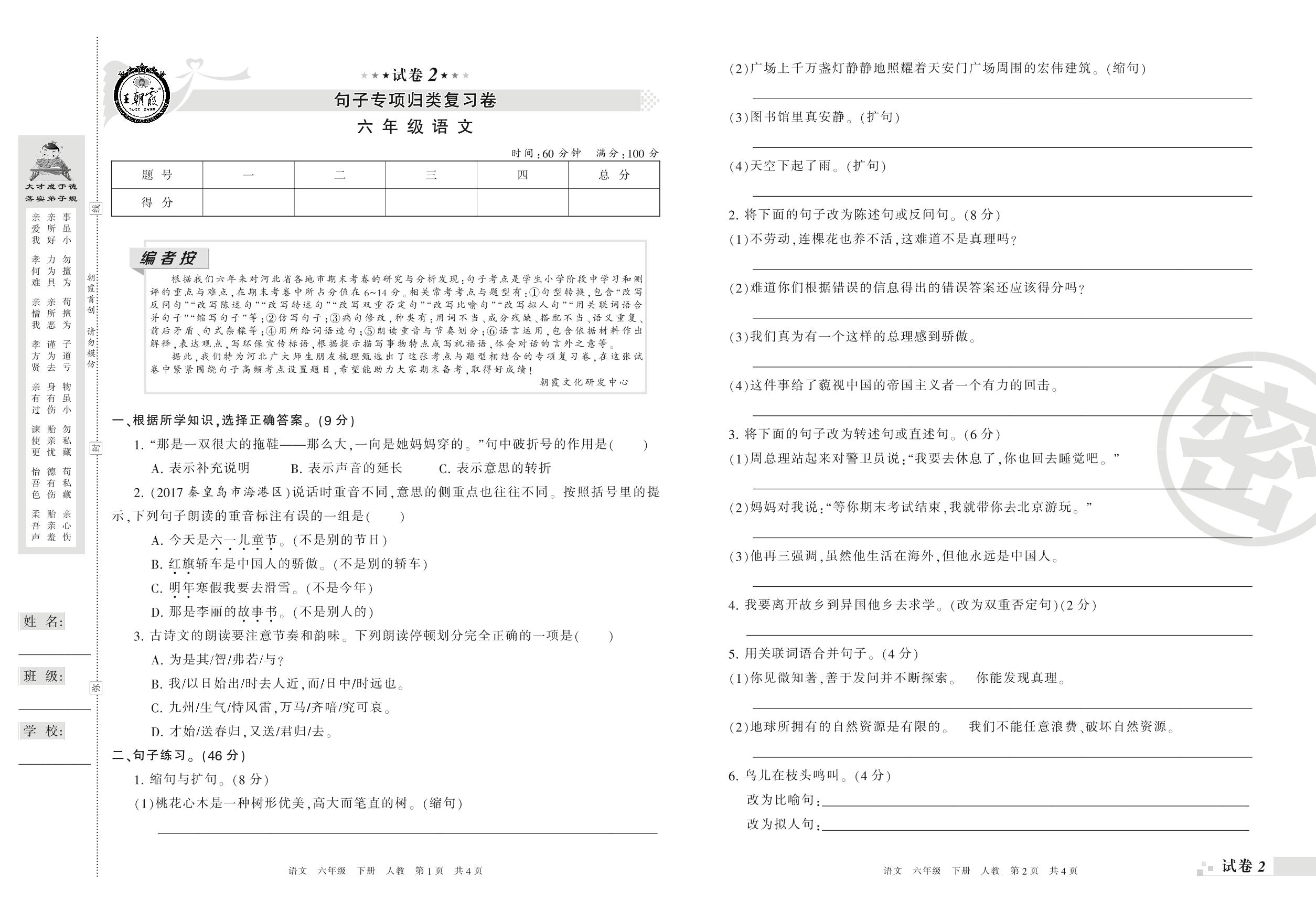 王朝霞期末专项卷——句子专项归类复习卷六年级下册语文(人教版)_R210802121204【2】