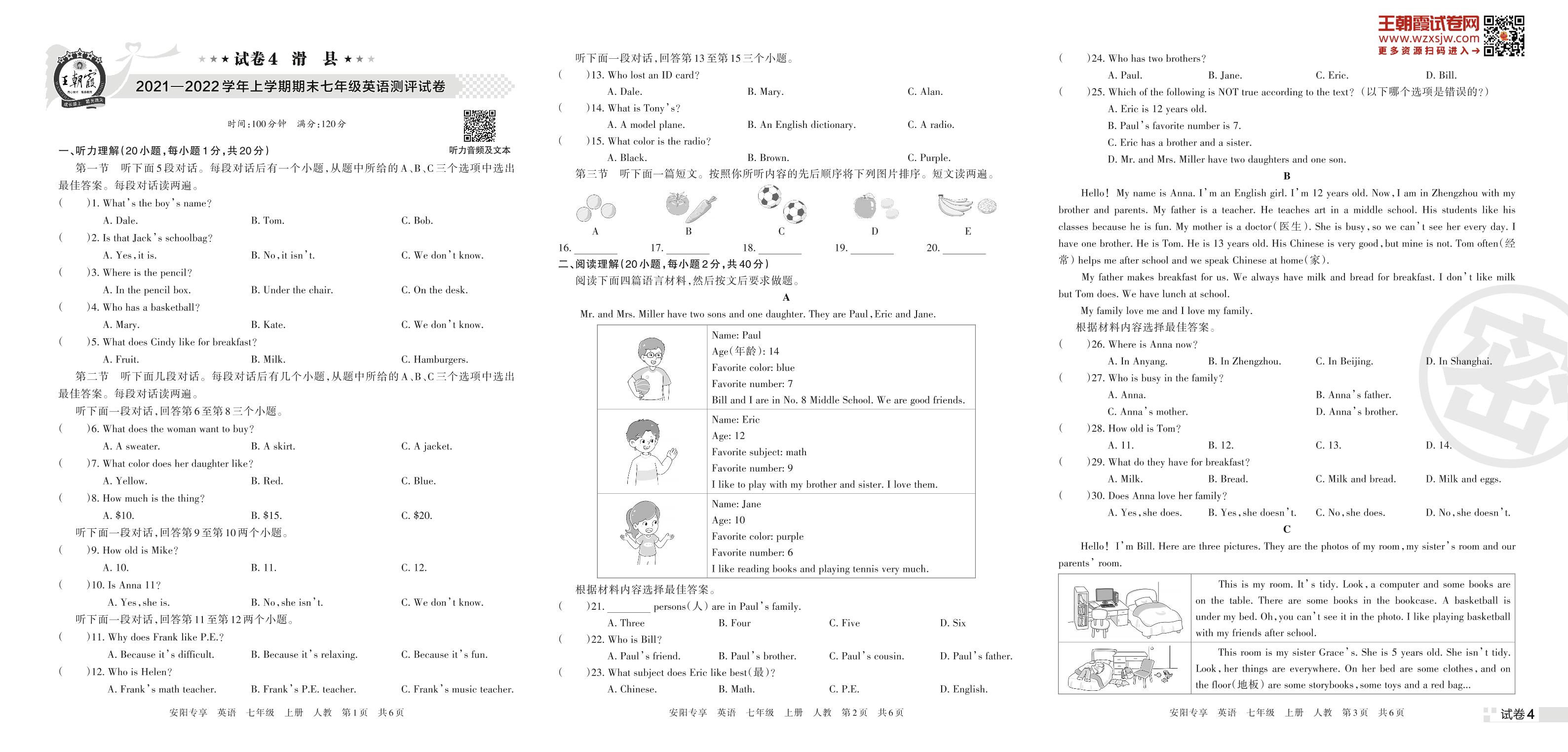 滑县2021—2022学年上学期期末七年级英语测评试卷(人教版)【4】