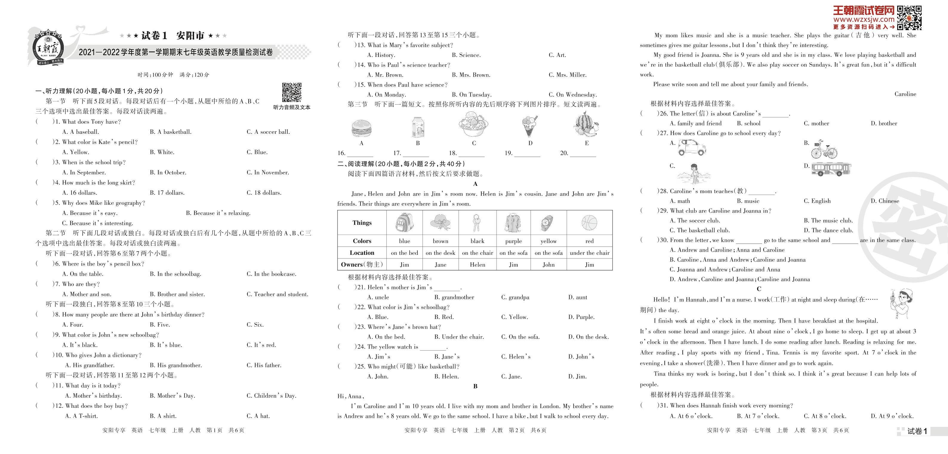 安阳市2021—2022学年度第一学期期末七年级英语教学质量检测试卷(人教版)【1】