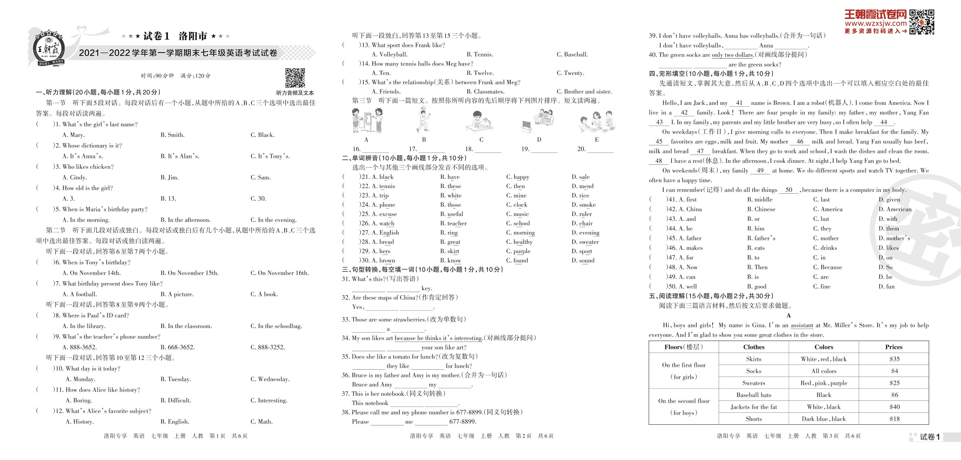 洛阳市2021—2022学年第一学期期末七年级英语考试试卷(人教版)【1】