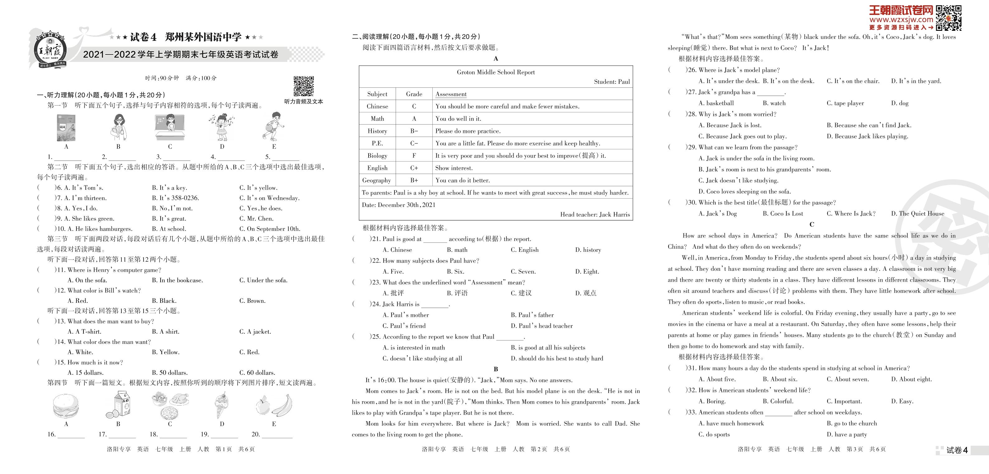 郑州某外国语中学2021—2022学年上学期期末七年级英语考试试卷(人教版)【4】