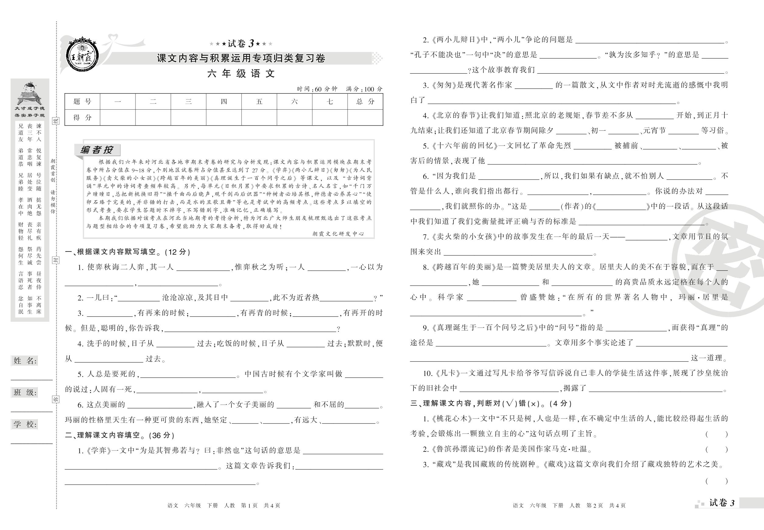 王朝霞期末专项卷——课文内容与积累运用专项归类复习卷六年级下册语文(人教版)_R210802121211【3】