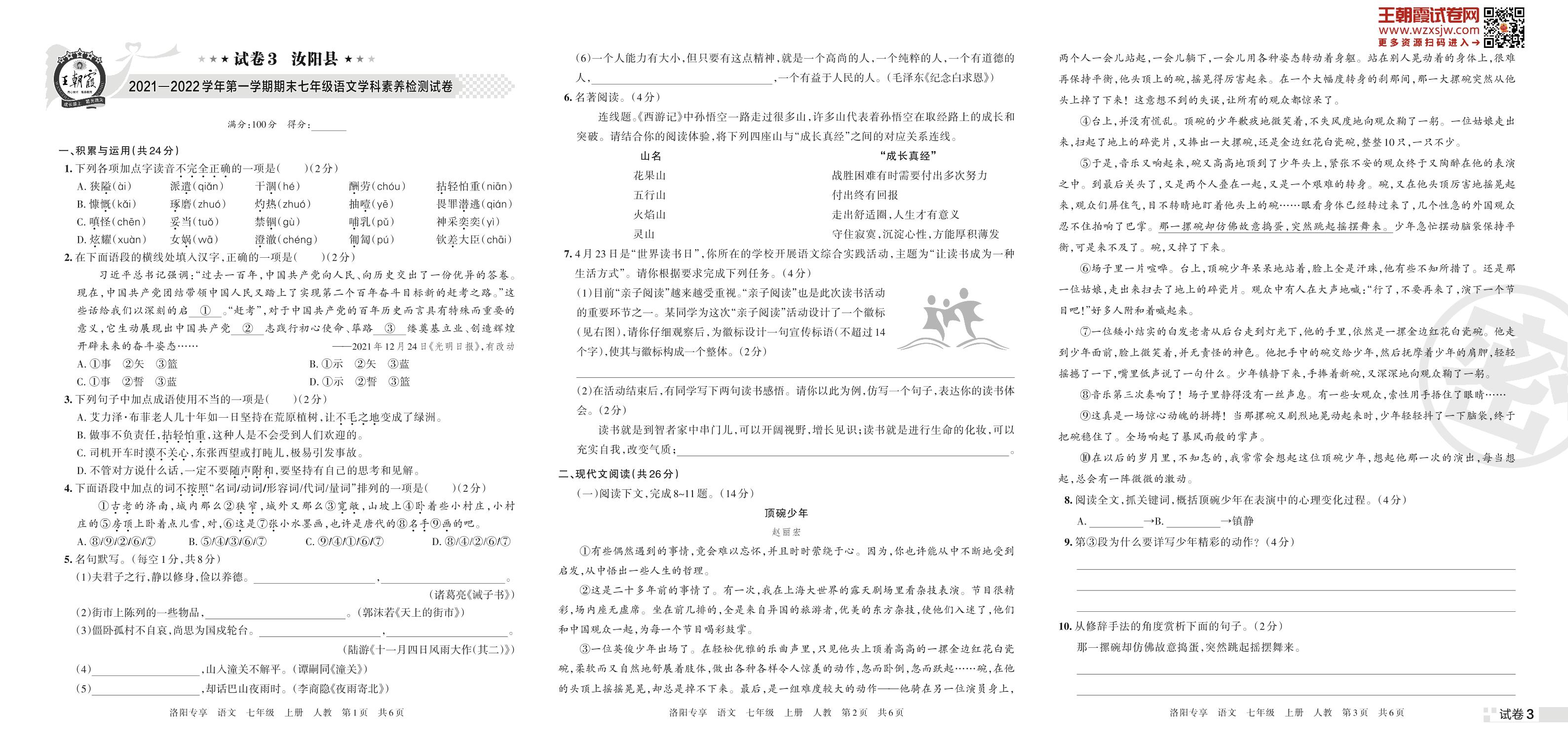 汝阳县2021—2022学年第一学期期末七年级语文学科素养检测试卷(人教版)【3】