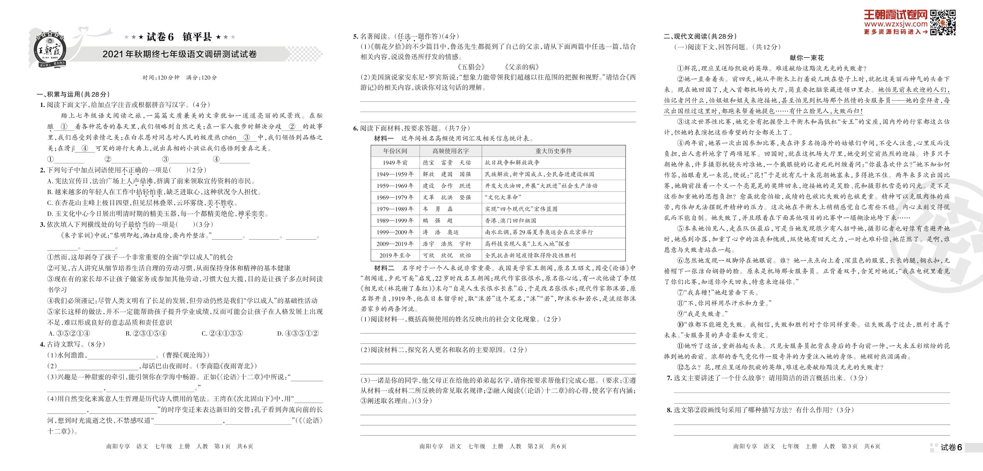 镇平县2021年秋期终七年级语文调研测试试卷(人教版)【6】