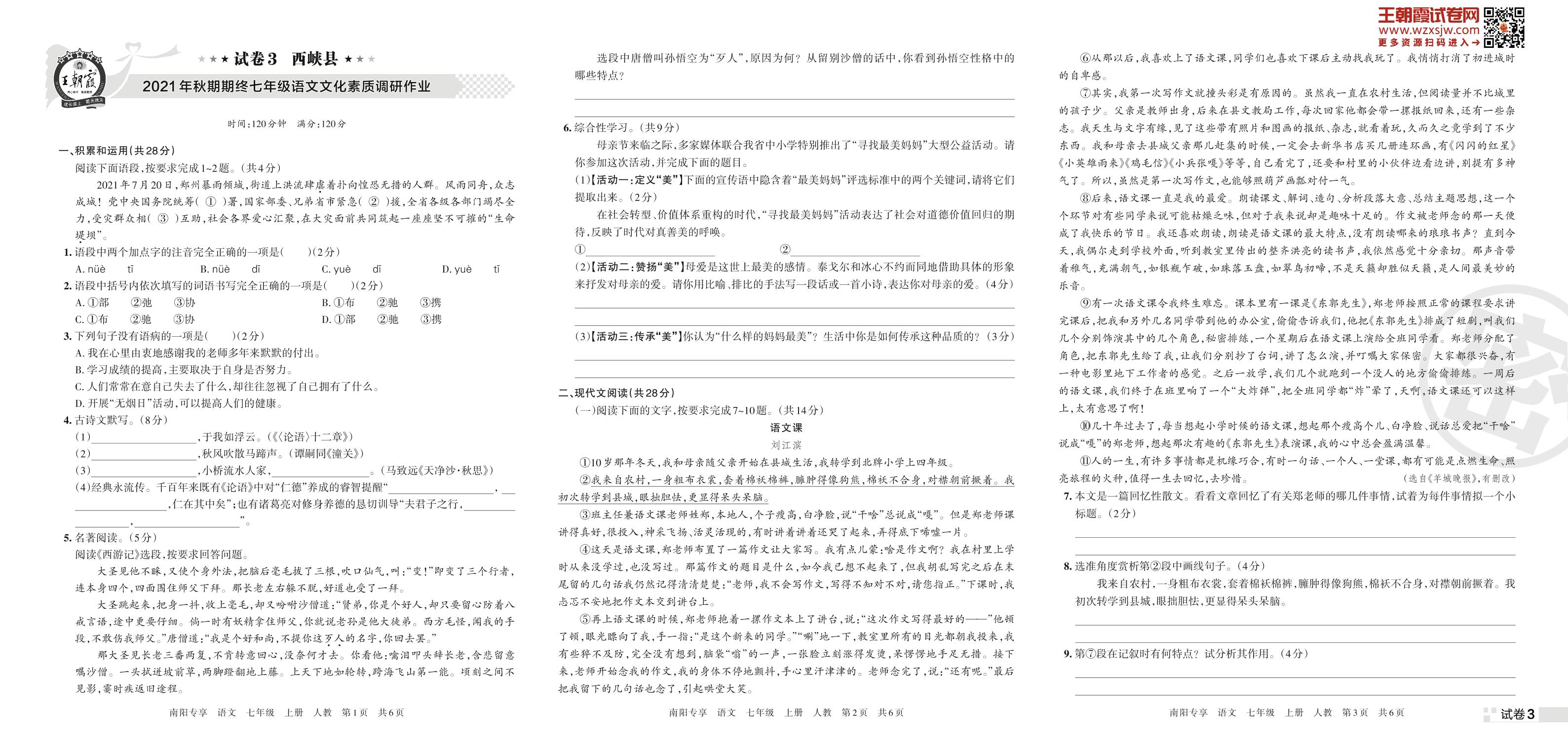 西峡县2021年秋期期终七年级语文文化素质调研作业(人教版)【3】