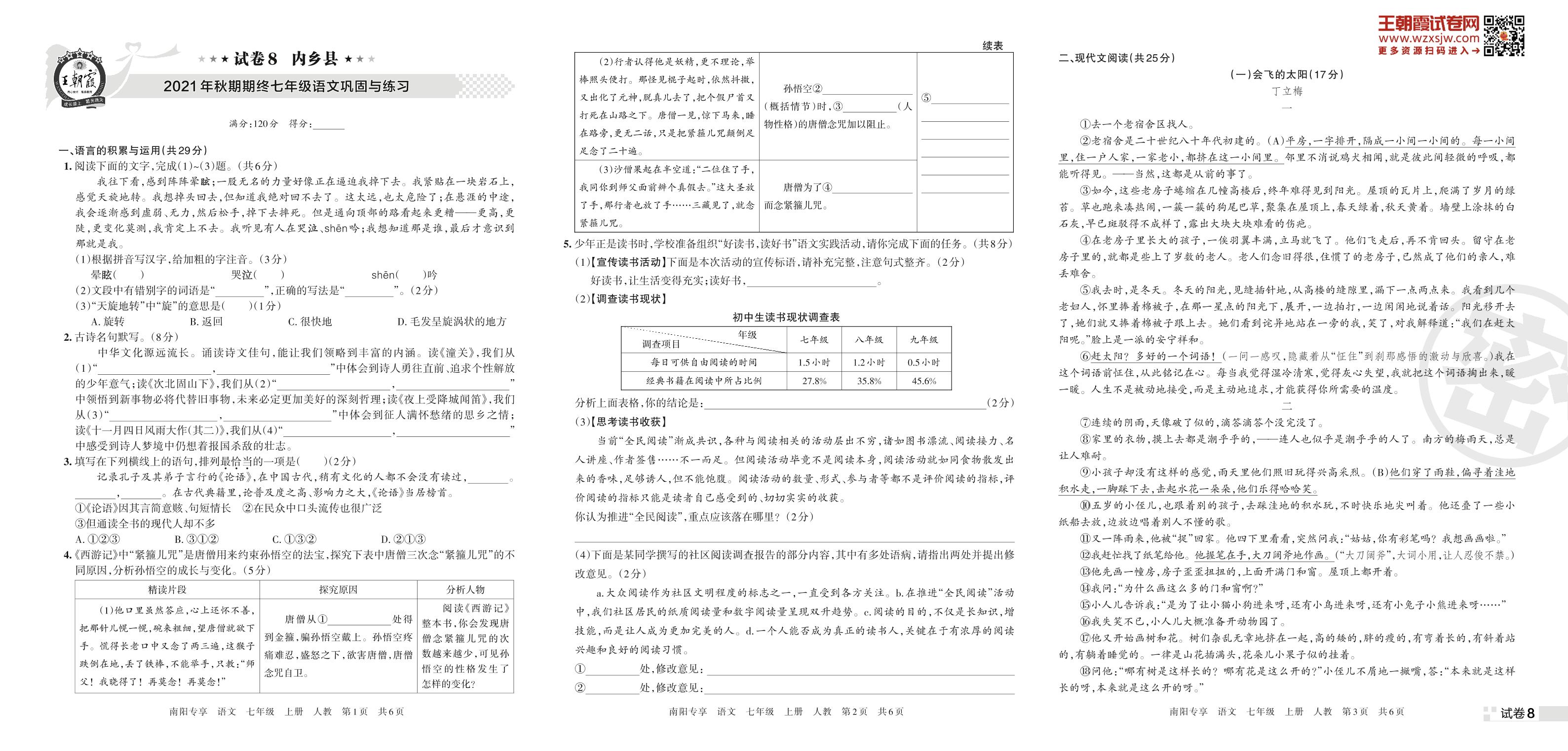 内乡县2021年秋期期终七年级语文巩固与练习(人教版)【8】