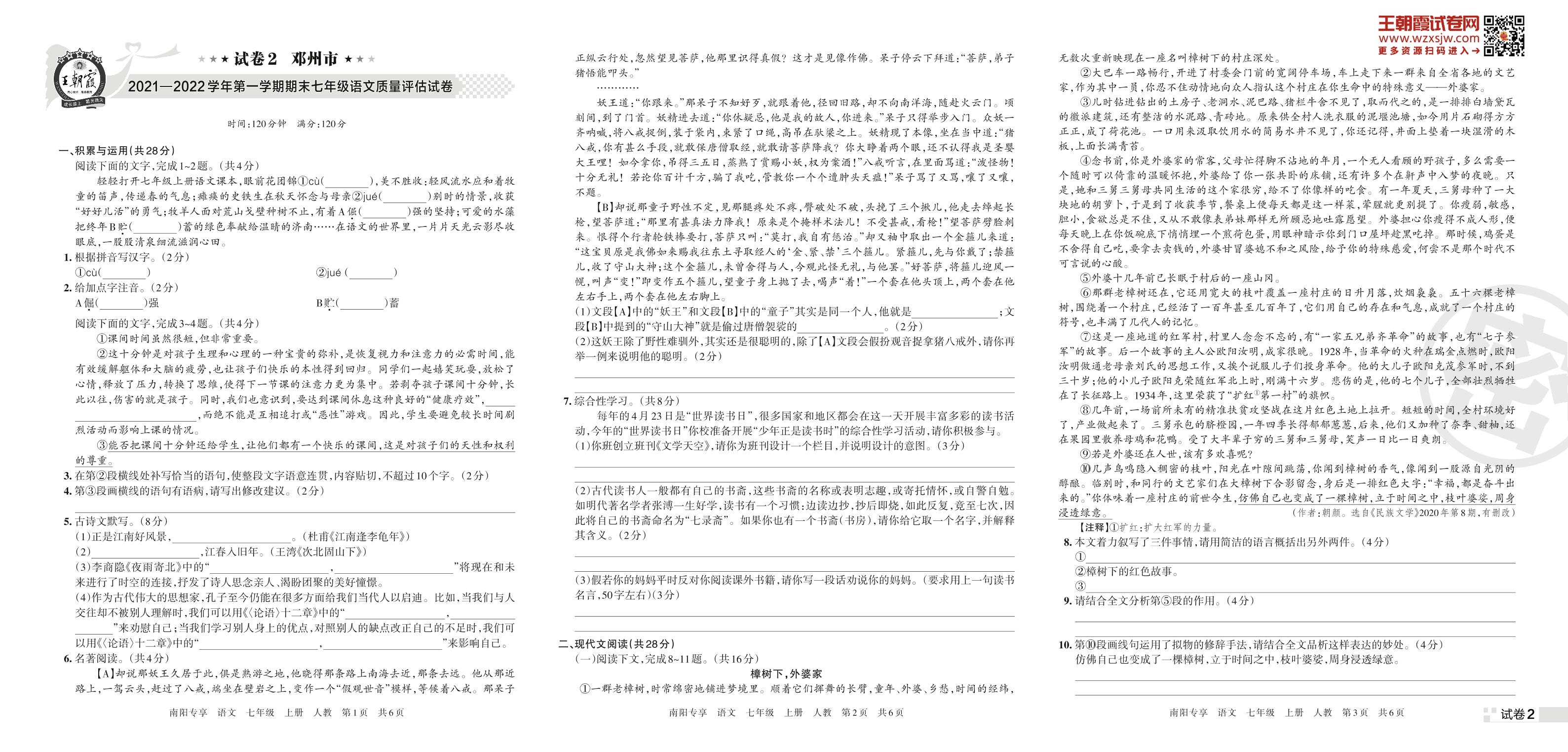 邓州市2021—2022学年第一学期期末七年级语文质量评估试卷(人教版)【2】