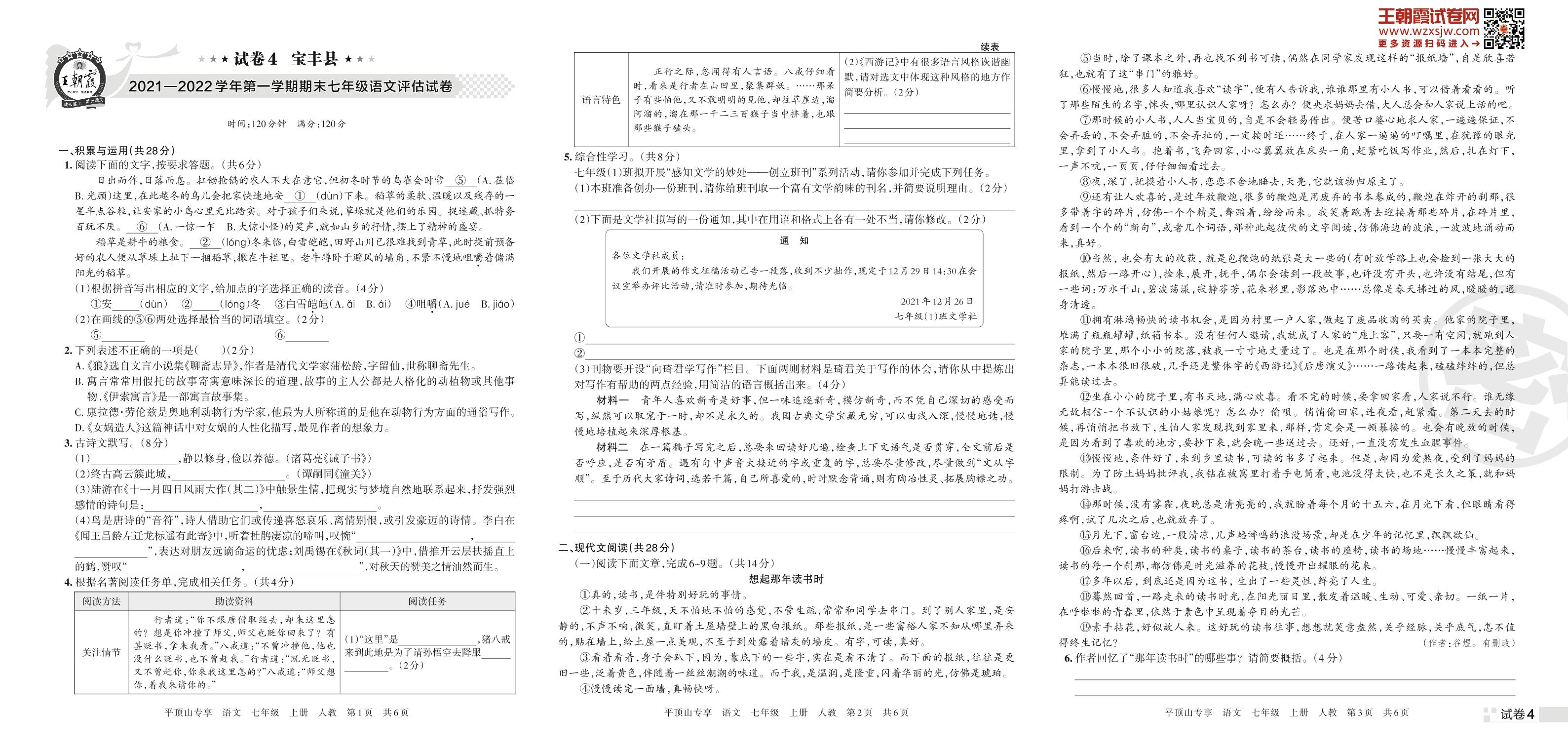 宝丰县2021—2022学年第一学期期末七年级语文评估试卷(人教版)【4】