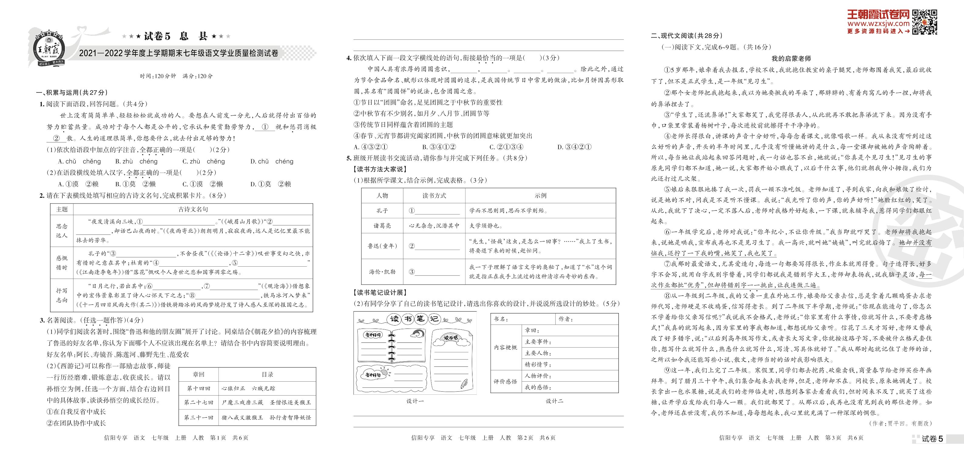 息县2021—2022学年度上学期期末七年级语文学业质量检测试卷(人教版)【5】