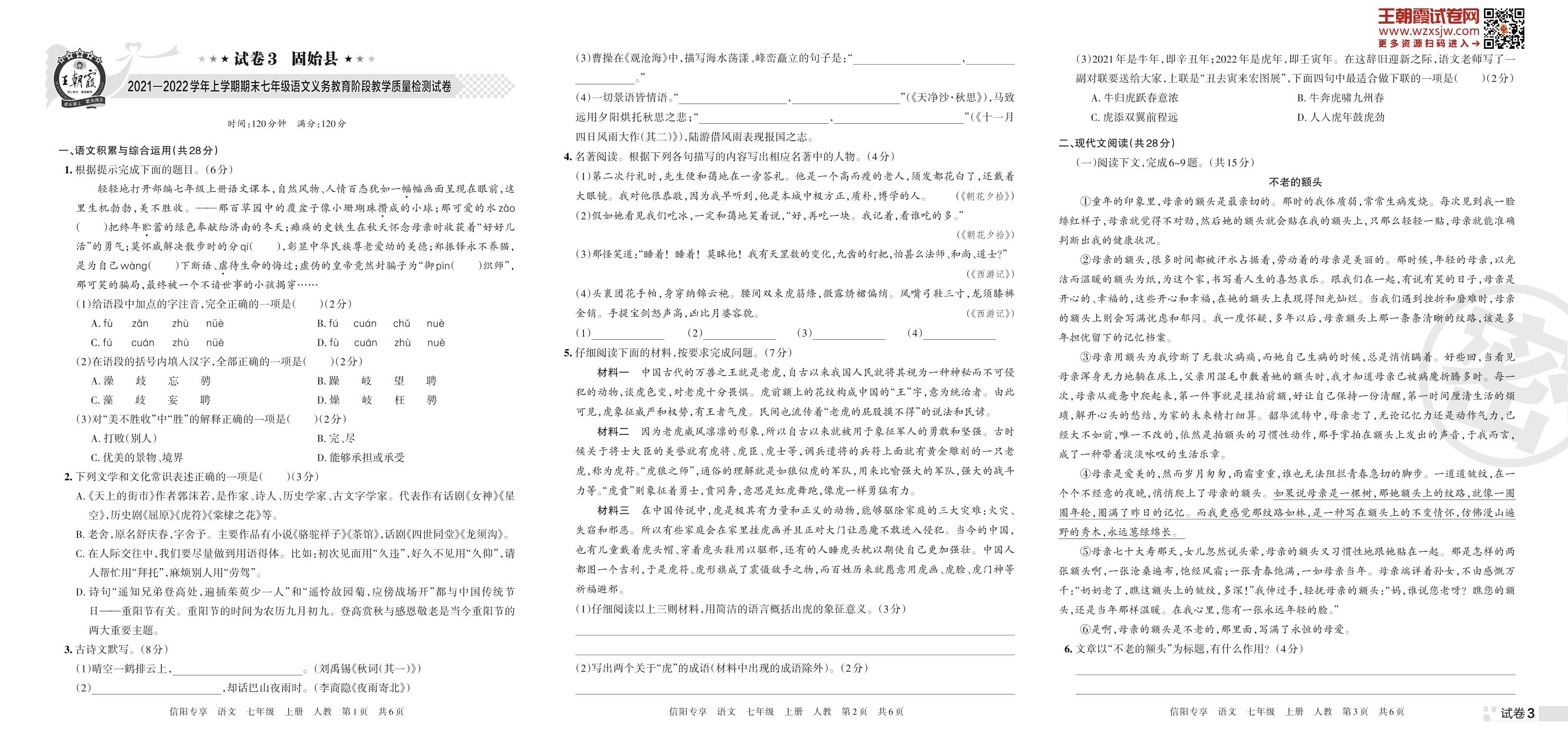 固始县2021—2022学年上学期期末七年级语文义务教育阶段教学质量检测试卷(人教版)【3】