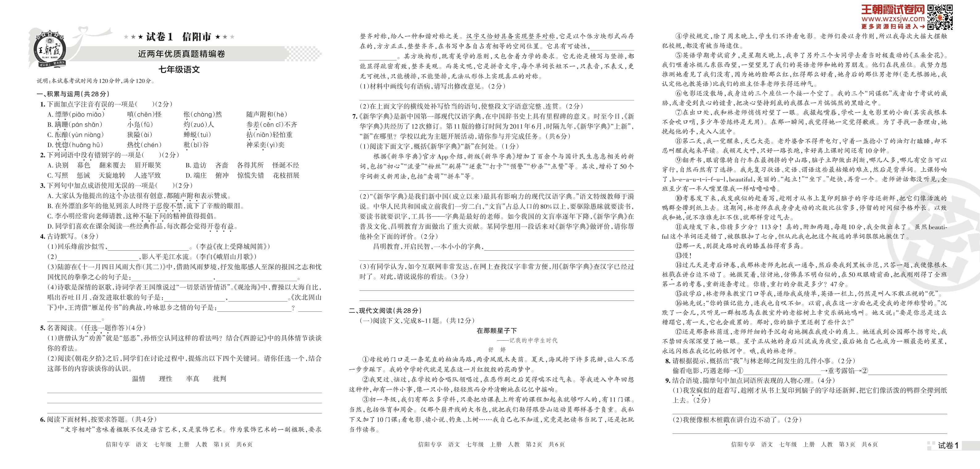 信阳市近两年优质真题精编卷七年级上册语文(人教版)【1】