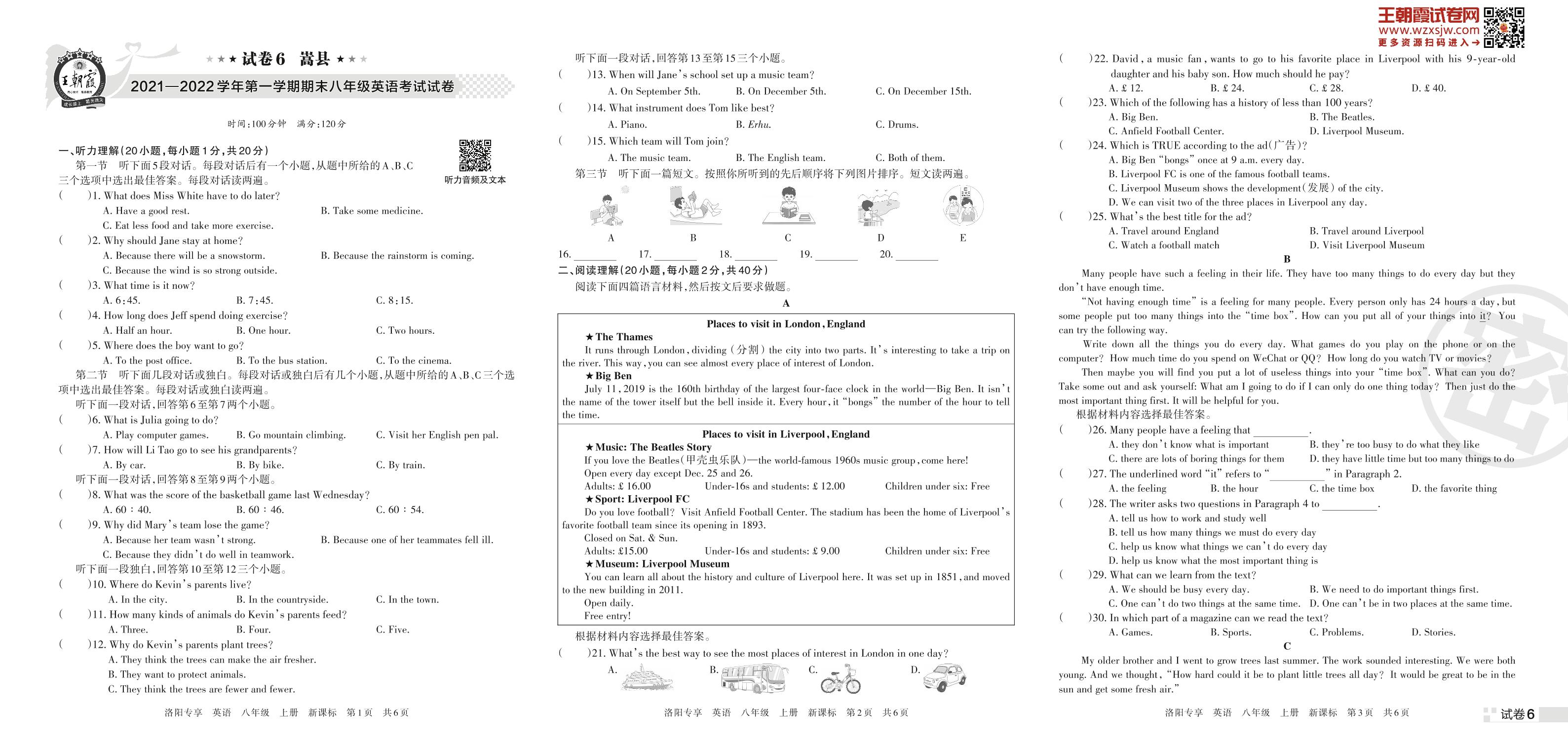 嵩县2021—2022学年第一学期期末八年级英语考试试卷(新课标版)【6】