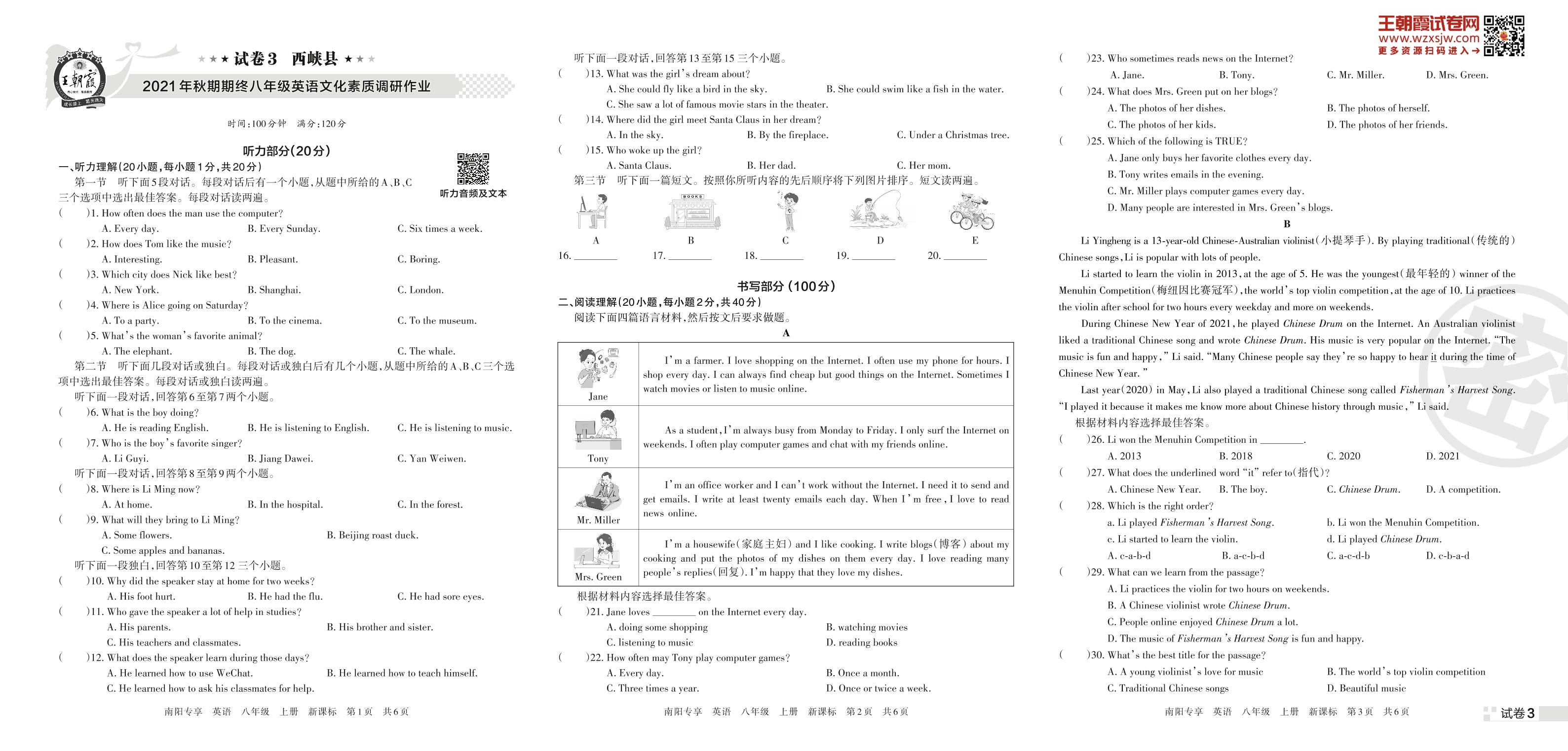 西峡县2021年秋期期终八年级英语文化素质调研作业(新课标版)【3】