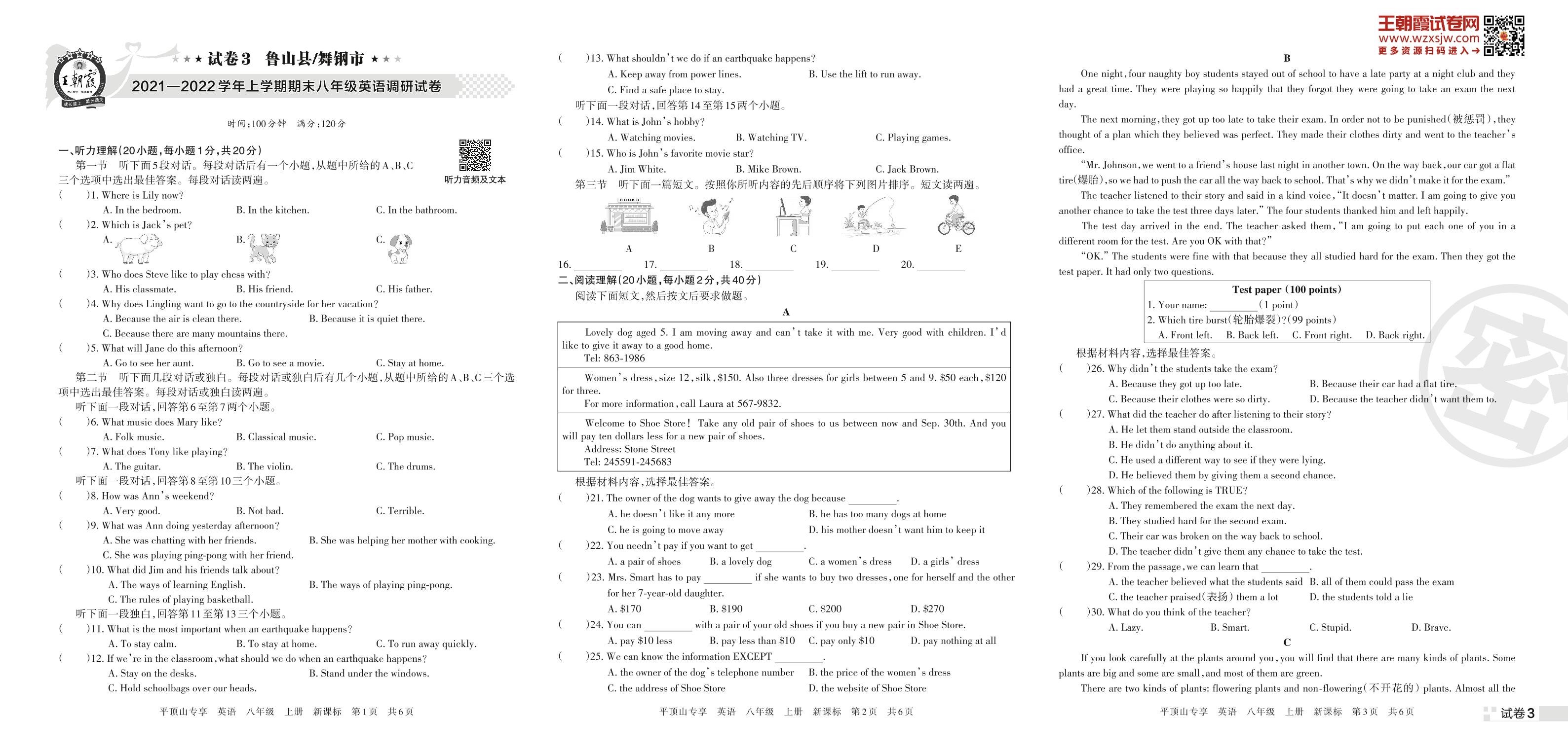 鲁山县、舞钢市2021—2022学年上学期期末八年级英语调研试卷(新课标版)【3】