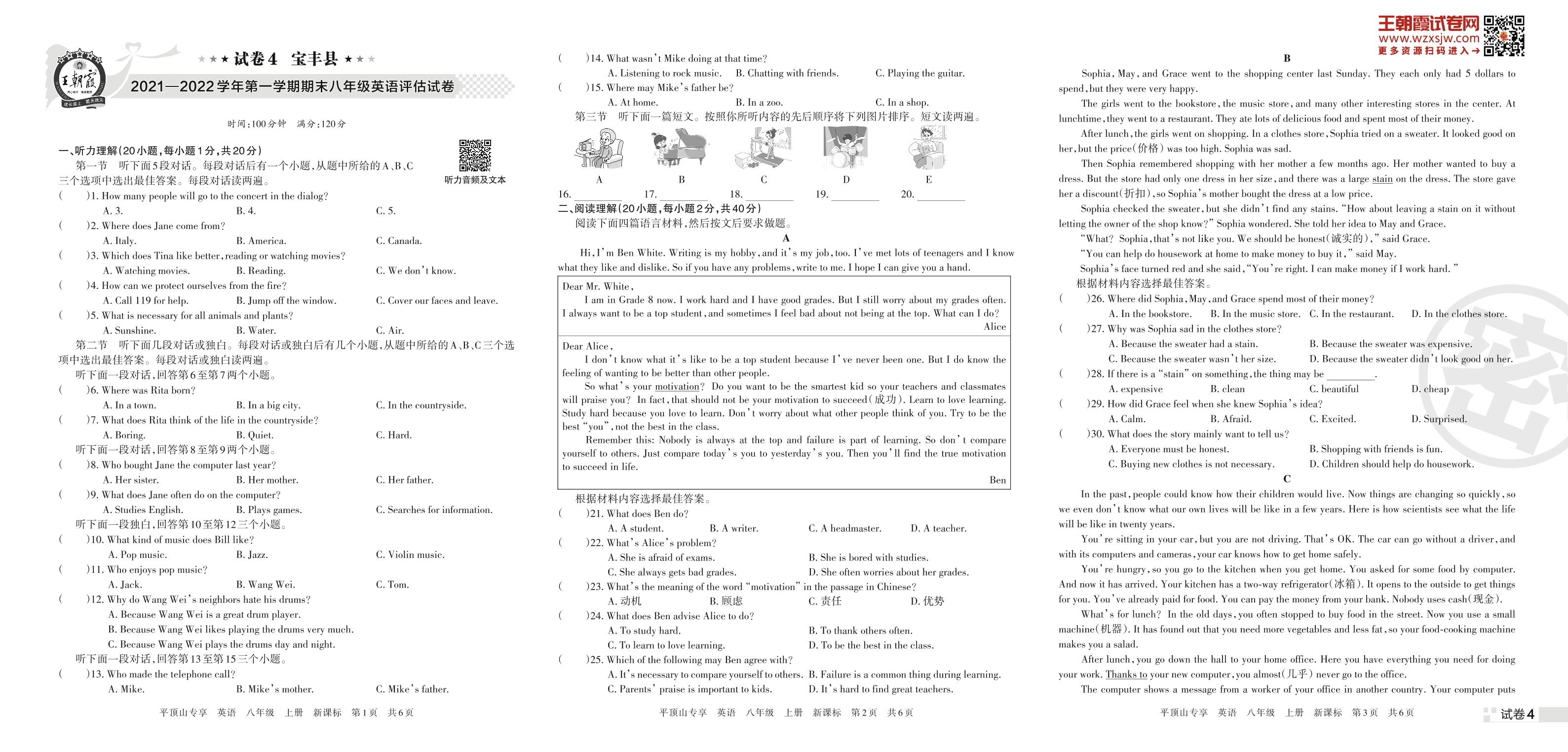 宝丰县2021—2022学年第一学期期末八年级英语评估试卷(新课标版)【4】