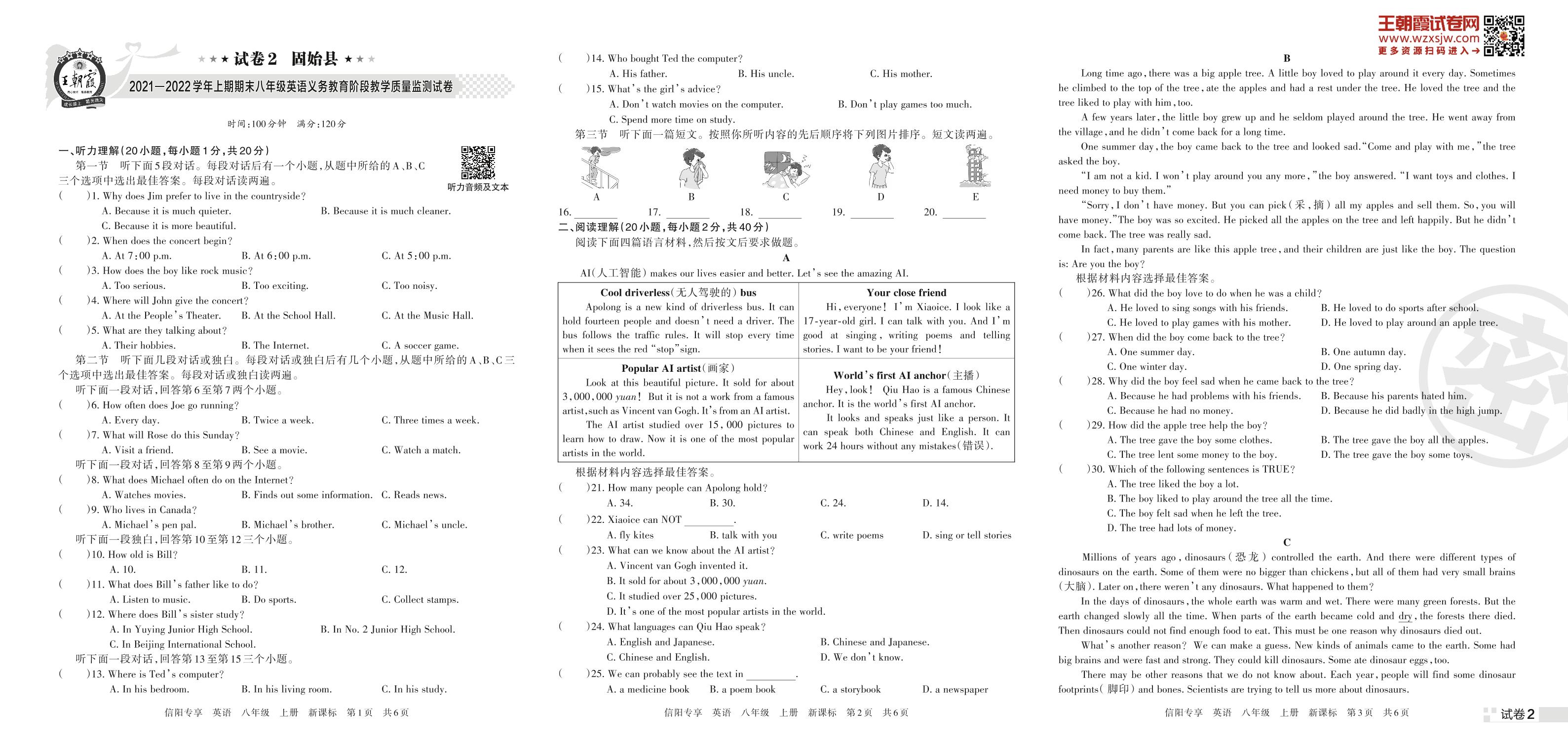固始县2021—2022学年上期期末八年级英语义务教育阶段教学质量监测试卷(新课标版)【2】