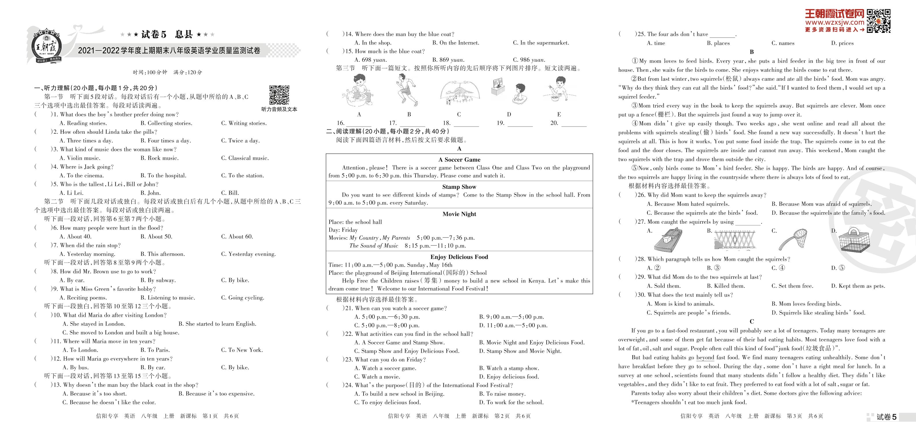 息县2021—2022学年度上期期末八年级英语学业质量监测试卷(新课标版)【5】