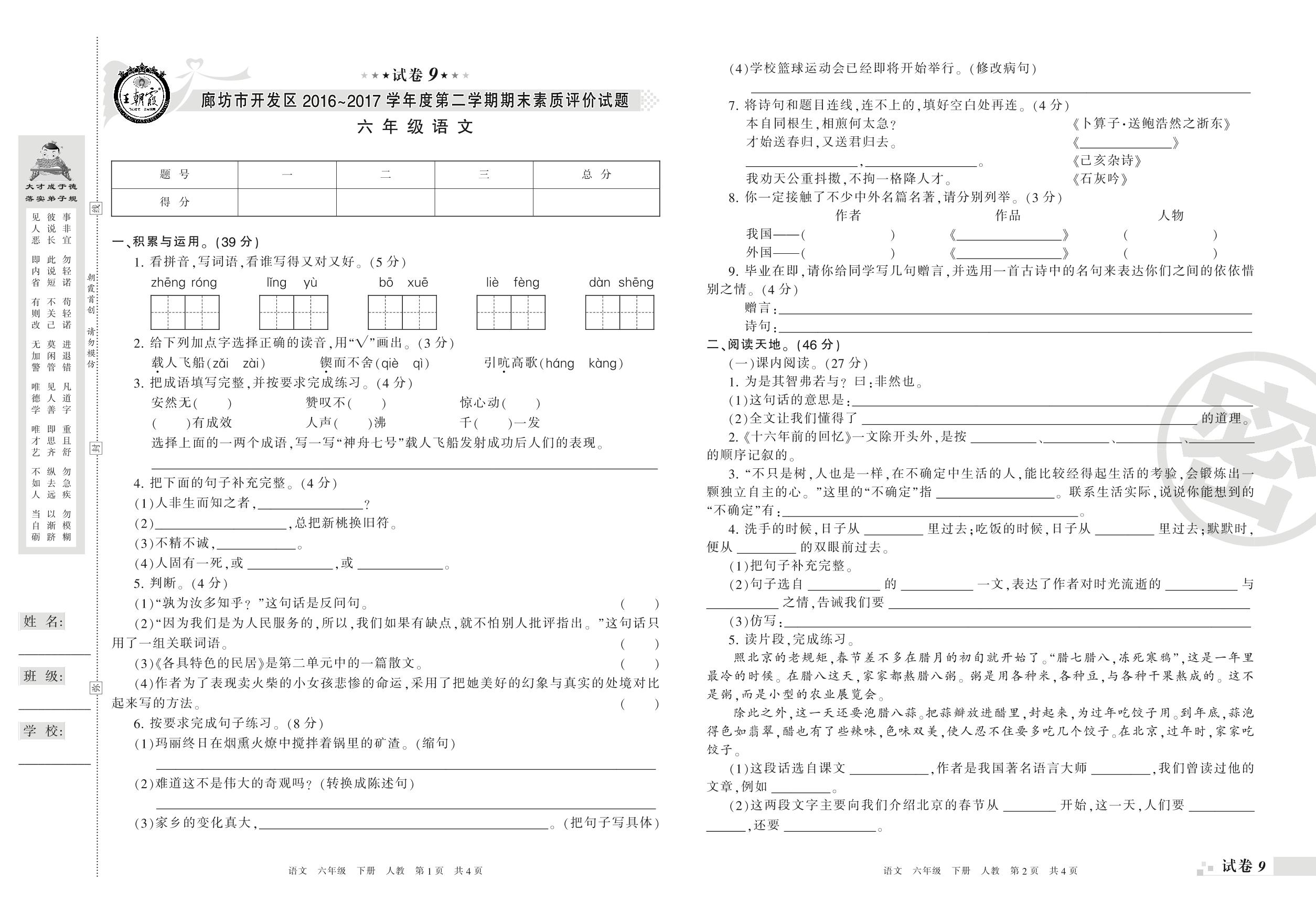 2016-2017学年第二学期廊坊市开发区六年级语文试卷(人教版)【9】