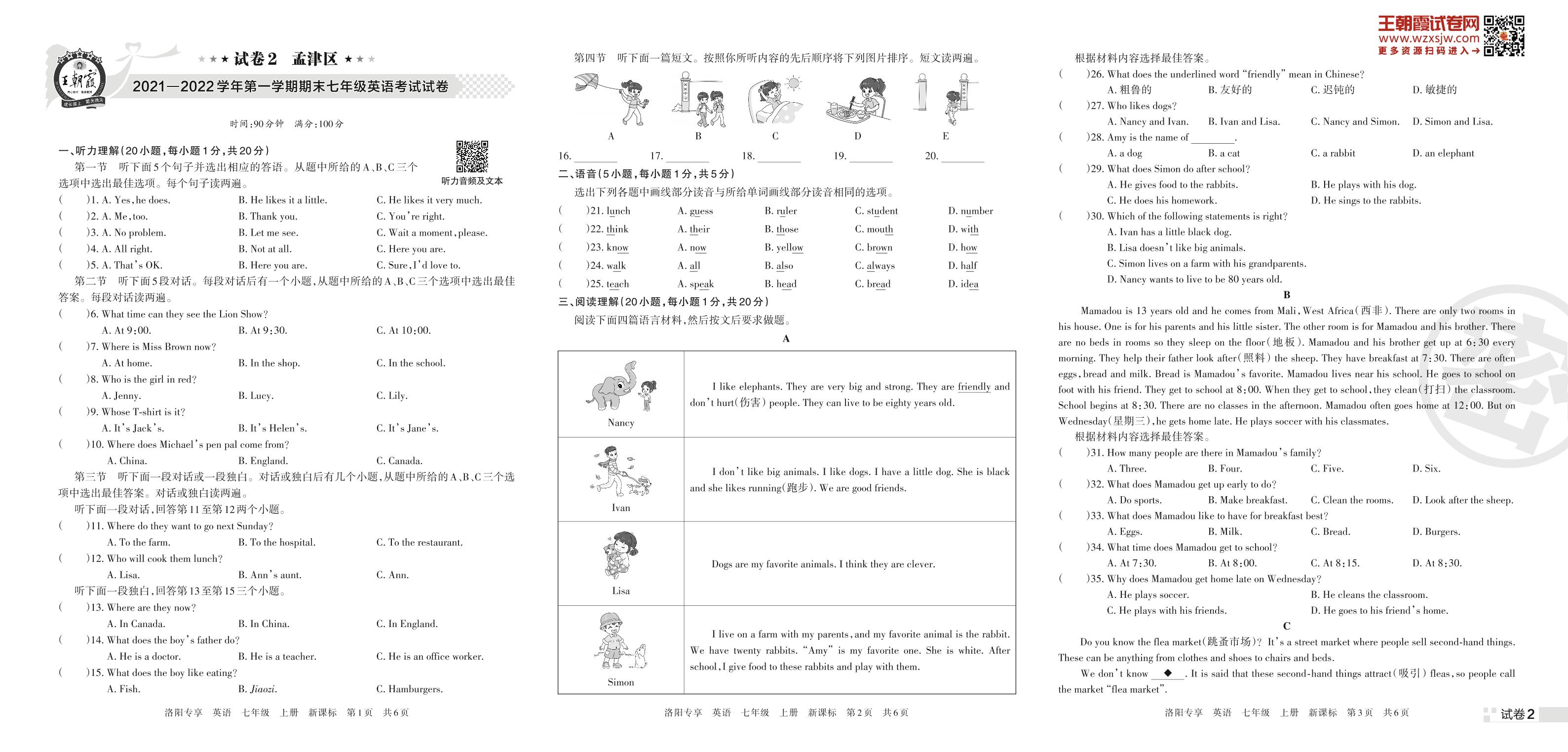 孟津区2021—2022学年第一学期期末七年级英语考试试卷(新课标版)【2】