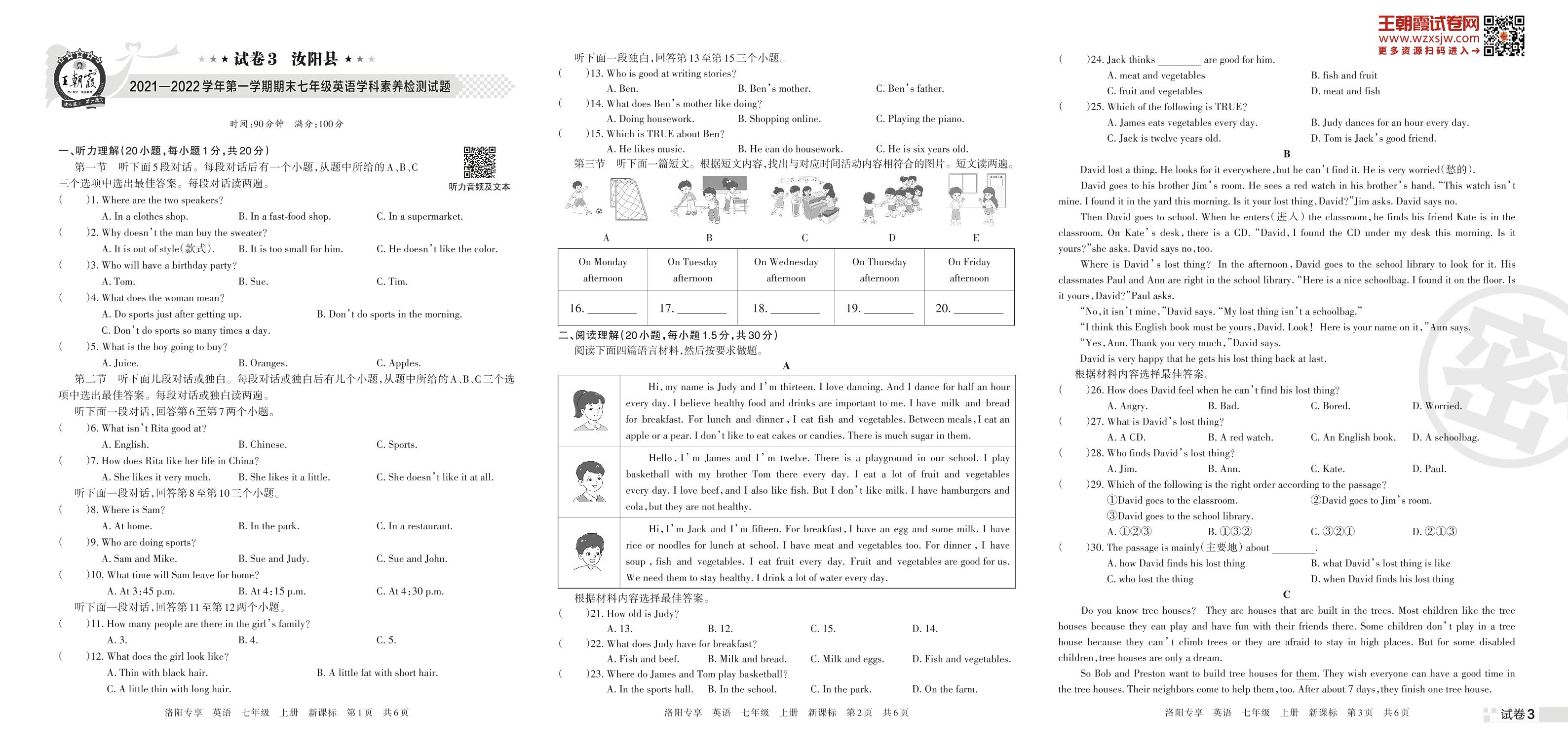 汝阳县2021—2022学年第一学期期末七年级英语学科素养检测试题(新课标版)【3】