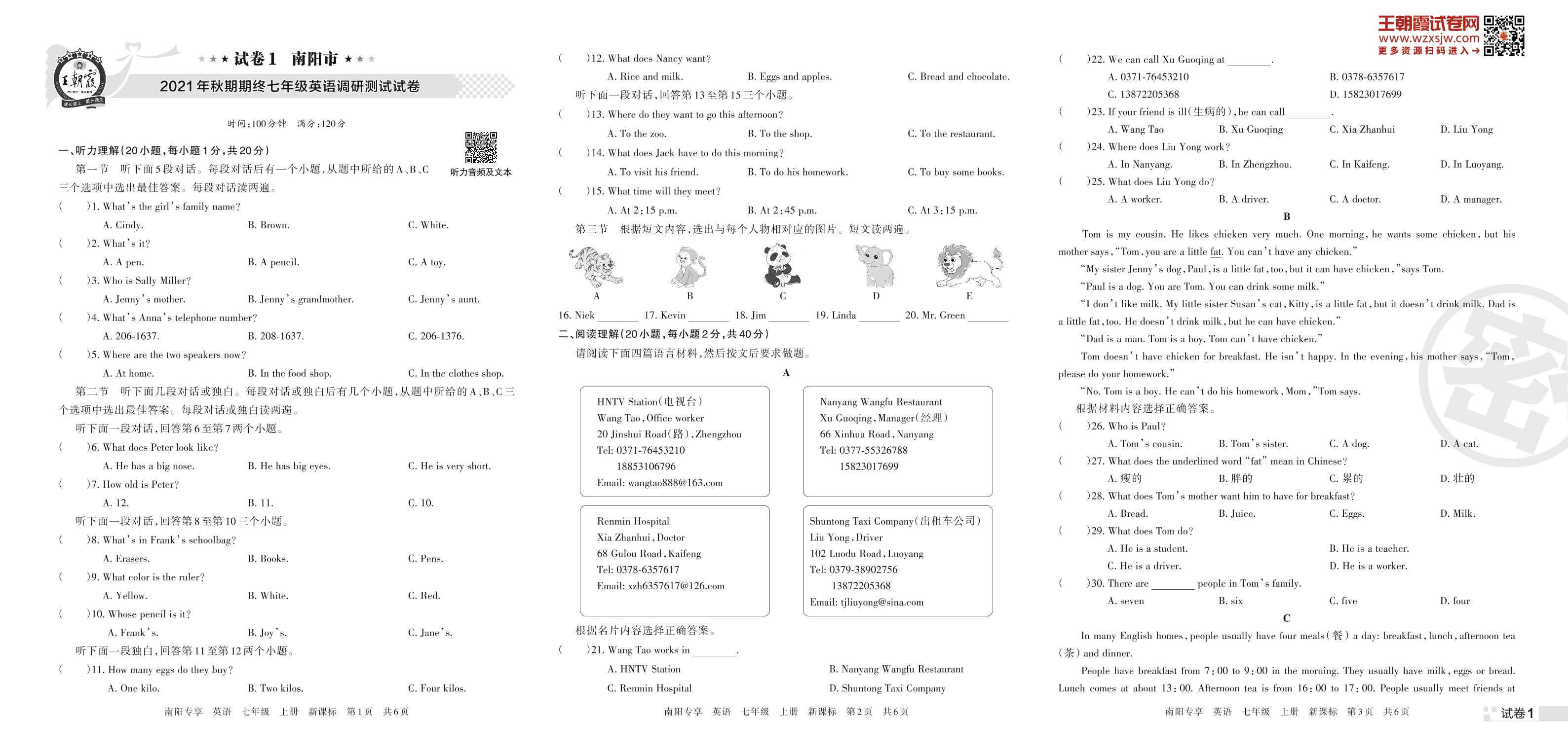 南阳市2021年秋期期终七年级英语调研测试试卷(新课标版)【1】