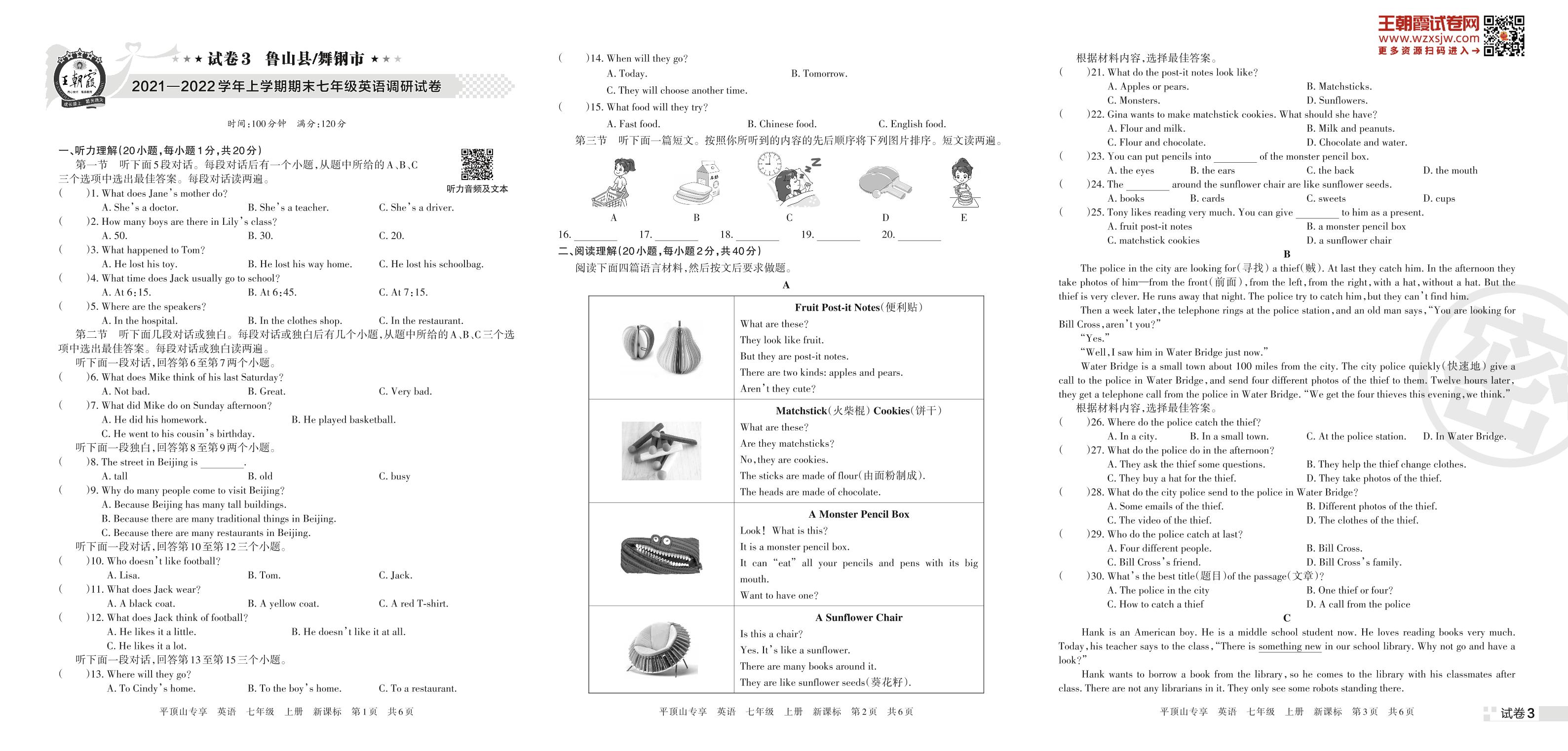 鲁山县、舞钢市2021—2022学年上学期期末七年级英语调研试卷(新课标版)【3】