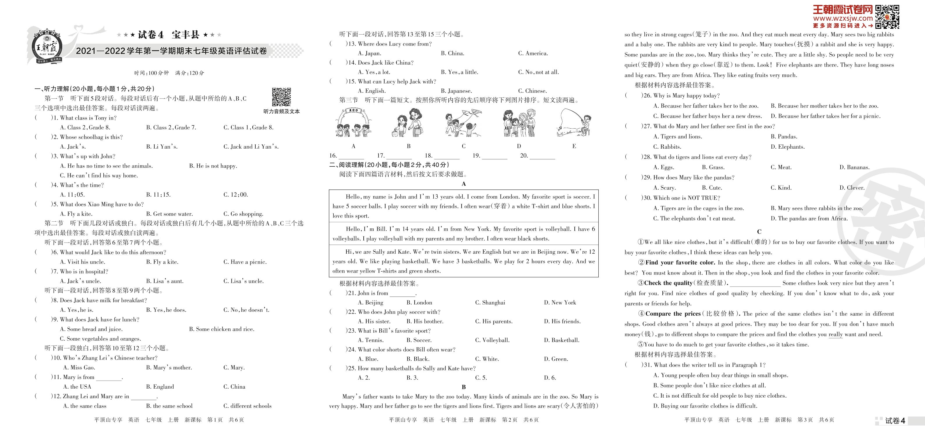 宝丰县2021—2022学年第一学期期末七年级英语评估试卷(新课标版)【4】