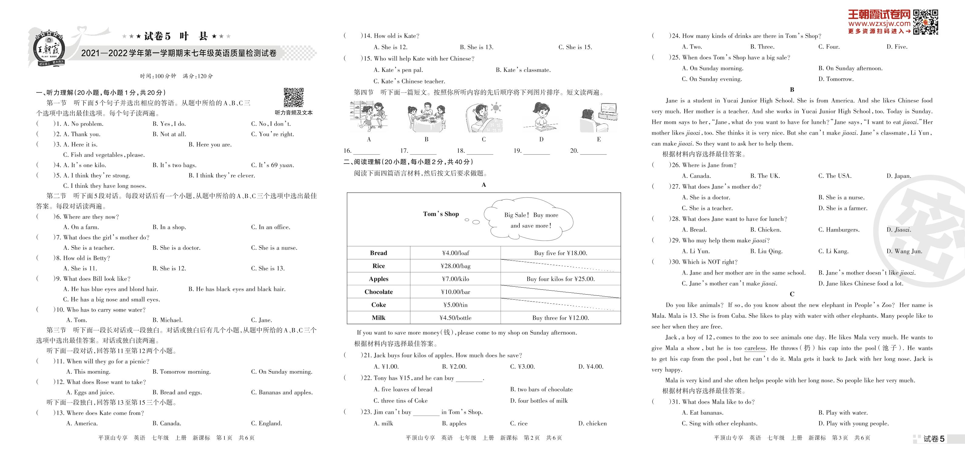 叶县2021—2022学年第一学期期末七年级英语质量检测试卷(新课标版)【5】