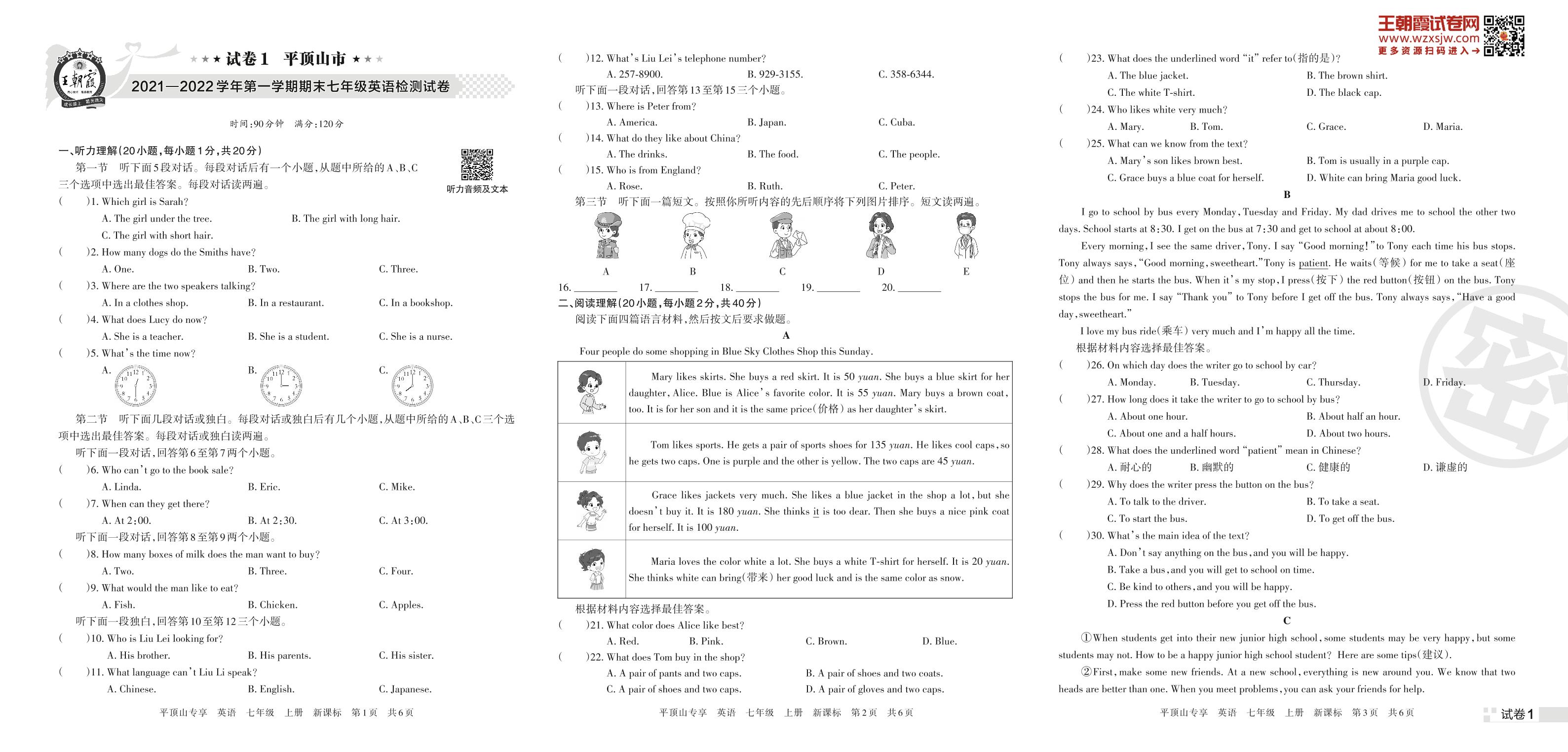 平顶山市2021—2022学年第一学期期末七年级英语检测试卷(新课标版)【1】