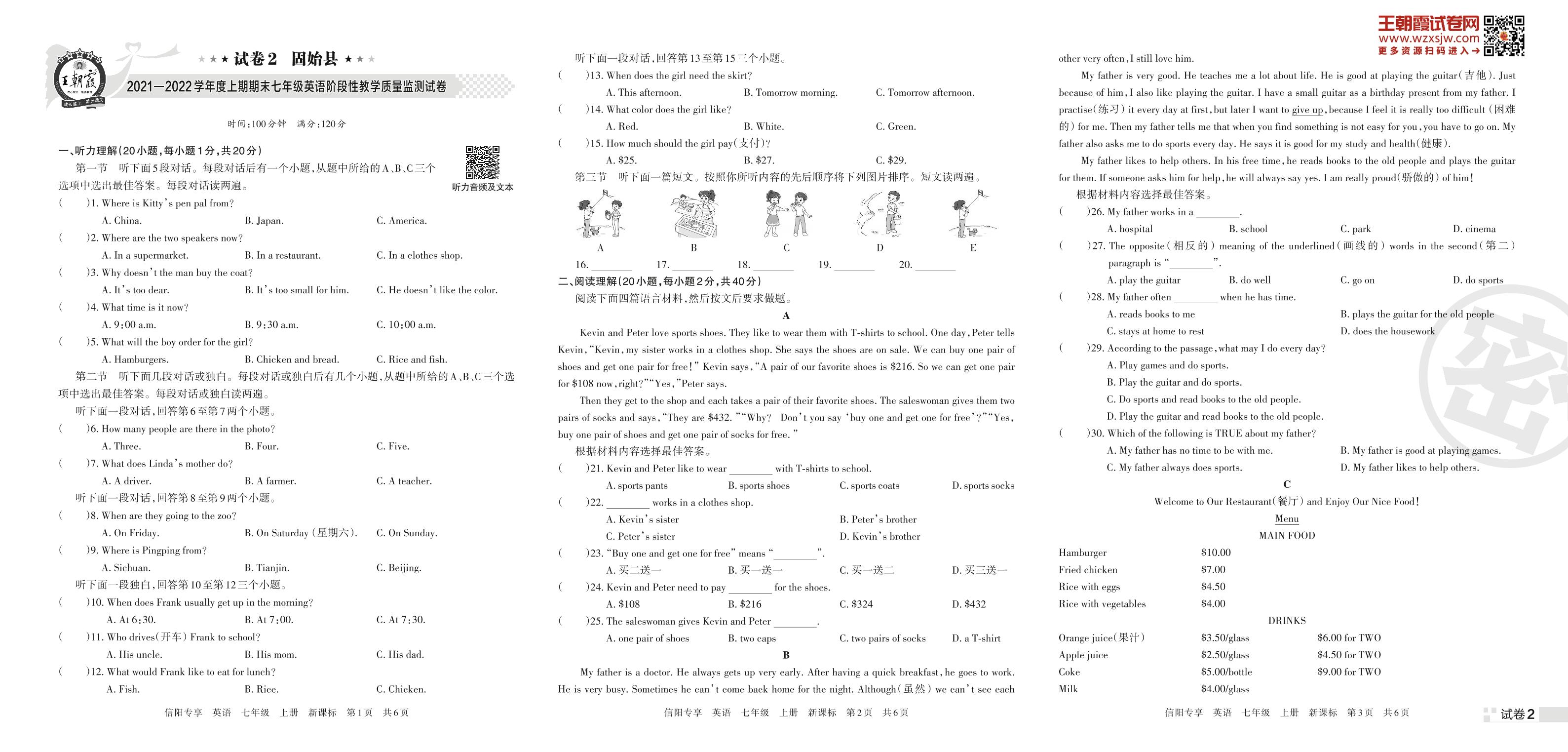 固始县2021—2022学年度上期期末七年级英语阶段性教学质量监测试卷(新课标版)【2】