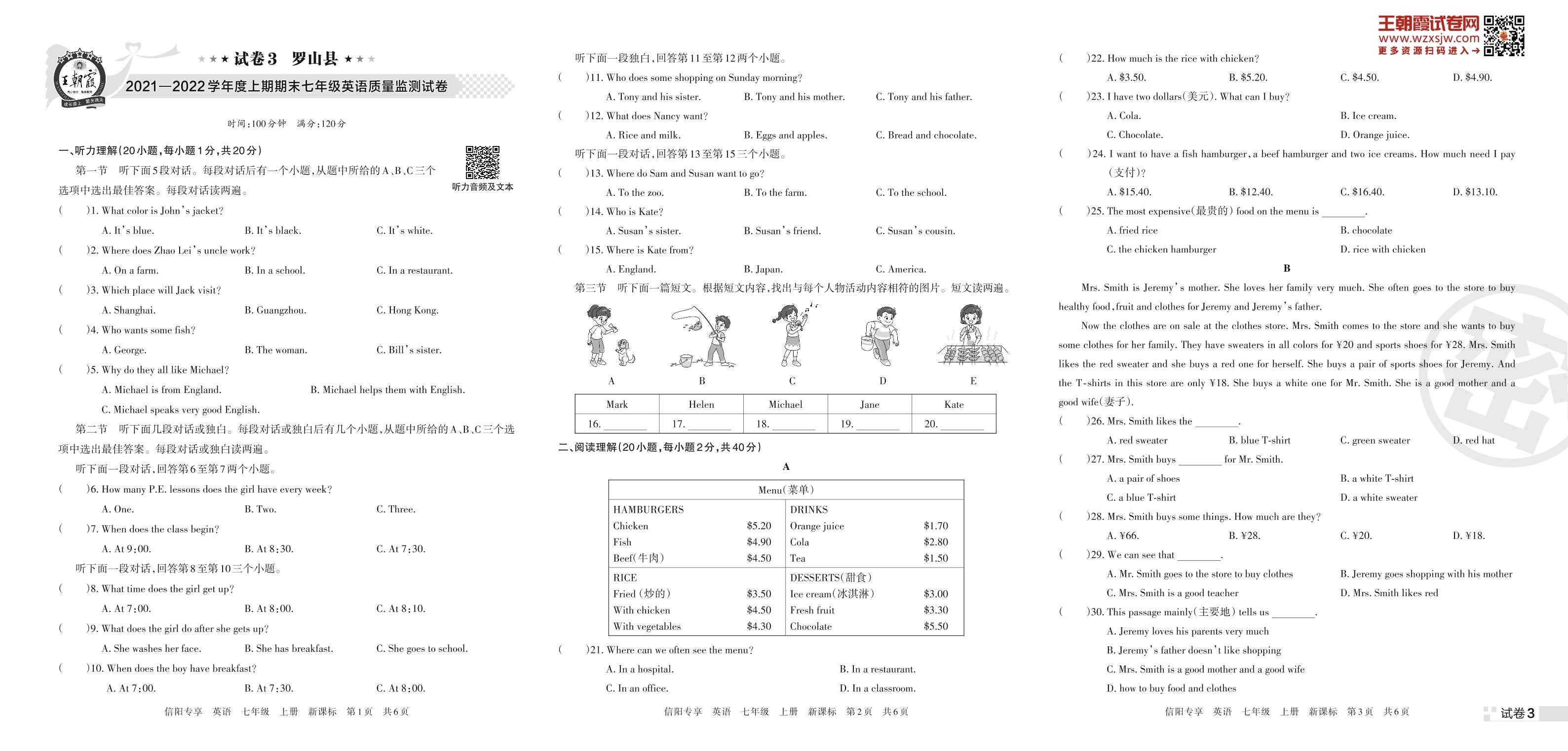 罗山县2021—2022学年度上期期末七年级英语质量监测试卷(新课标版)【3】