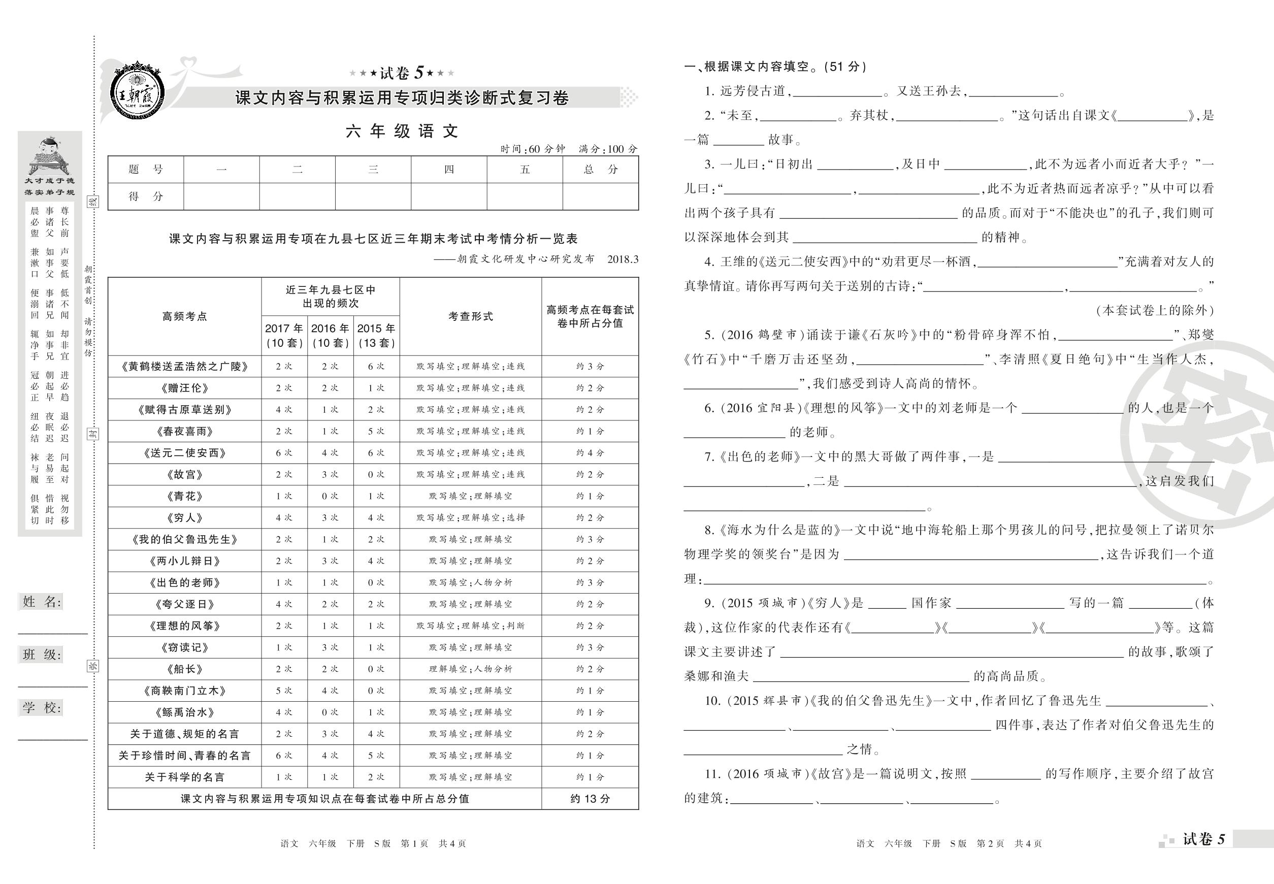 王朝霞期末专项卷——课文内容与积累运用专项归类诊断式复习卷六年级下册语文(S版)_R210802121319【5】