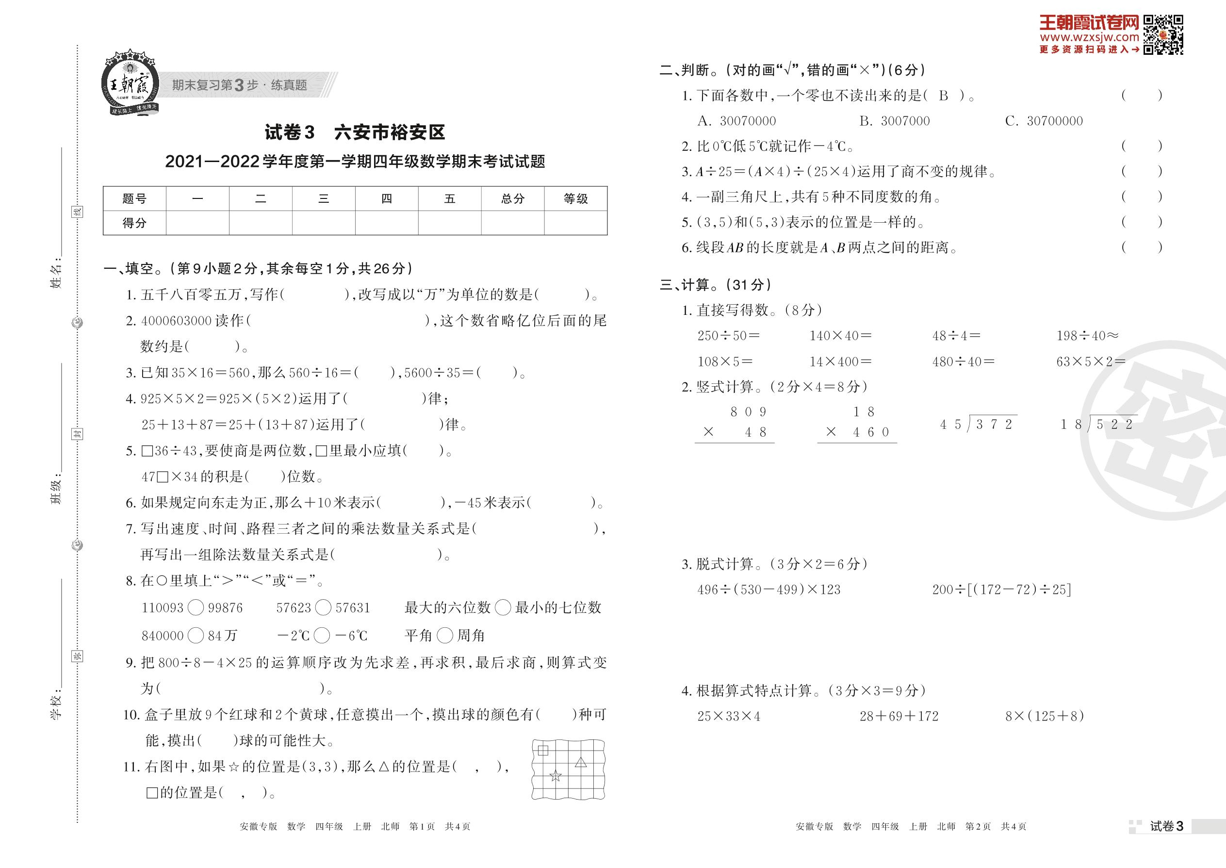 六安市裕安区2021—2022学年度第一学期四年级数学期末考试试题(北师版)【3】