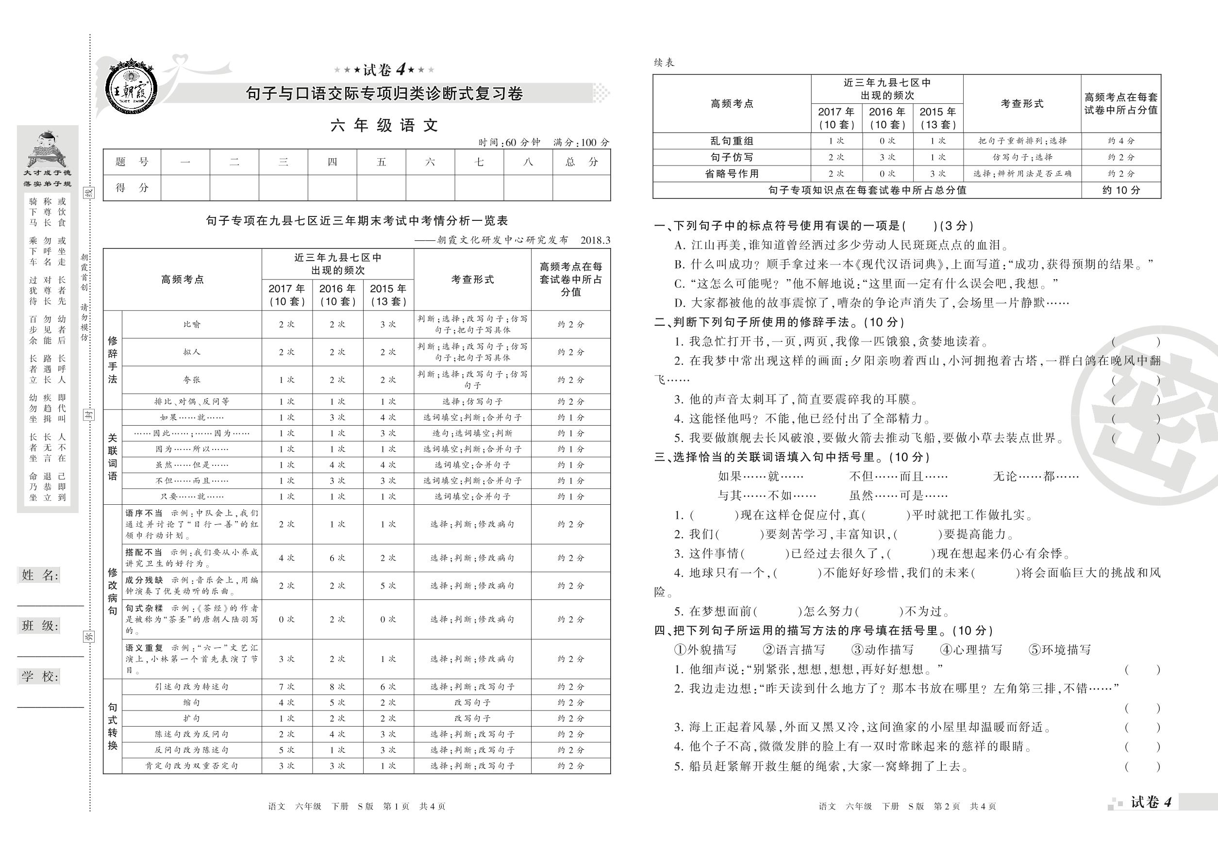 王朝霞期末专项卷——句子与口语交际专项归类诊断式复习卷六年级下册语文(S版)_R210802121322【4】