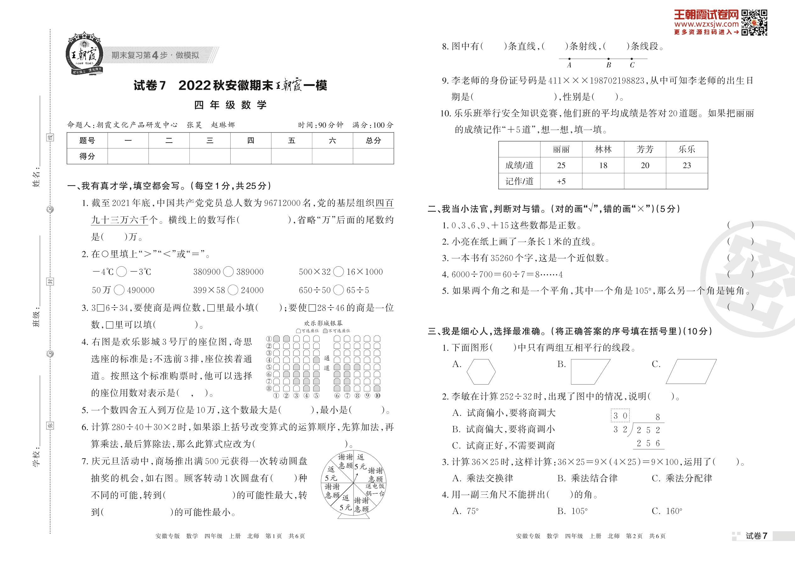 王朝霞期末模拟卷四年级上册数学(北师版)_R221126112745056【7】