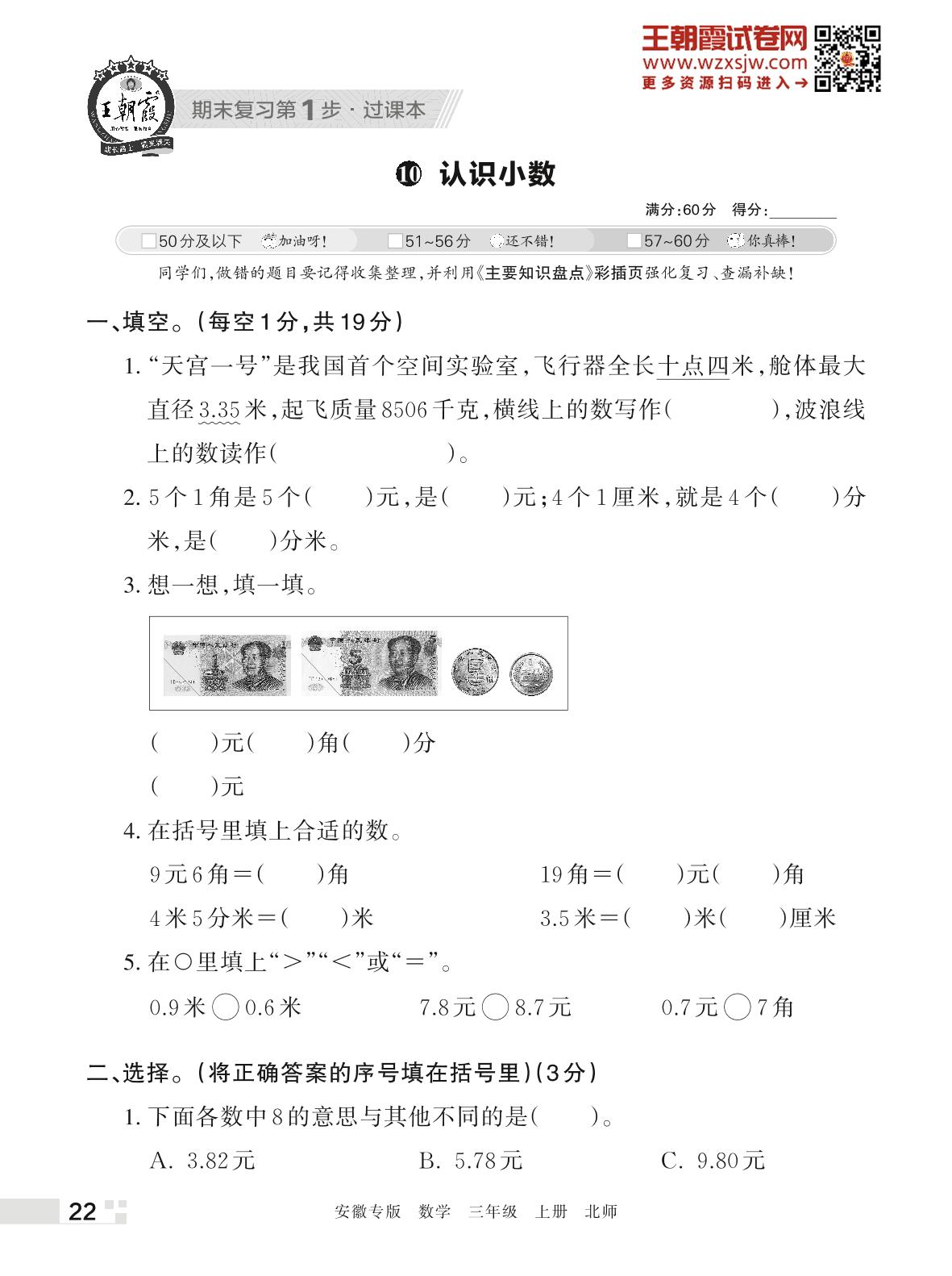 王朝霞期末过课本——10 认识小数三年级上册数学(北师版)_R221126115426477