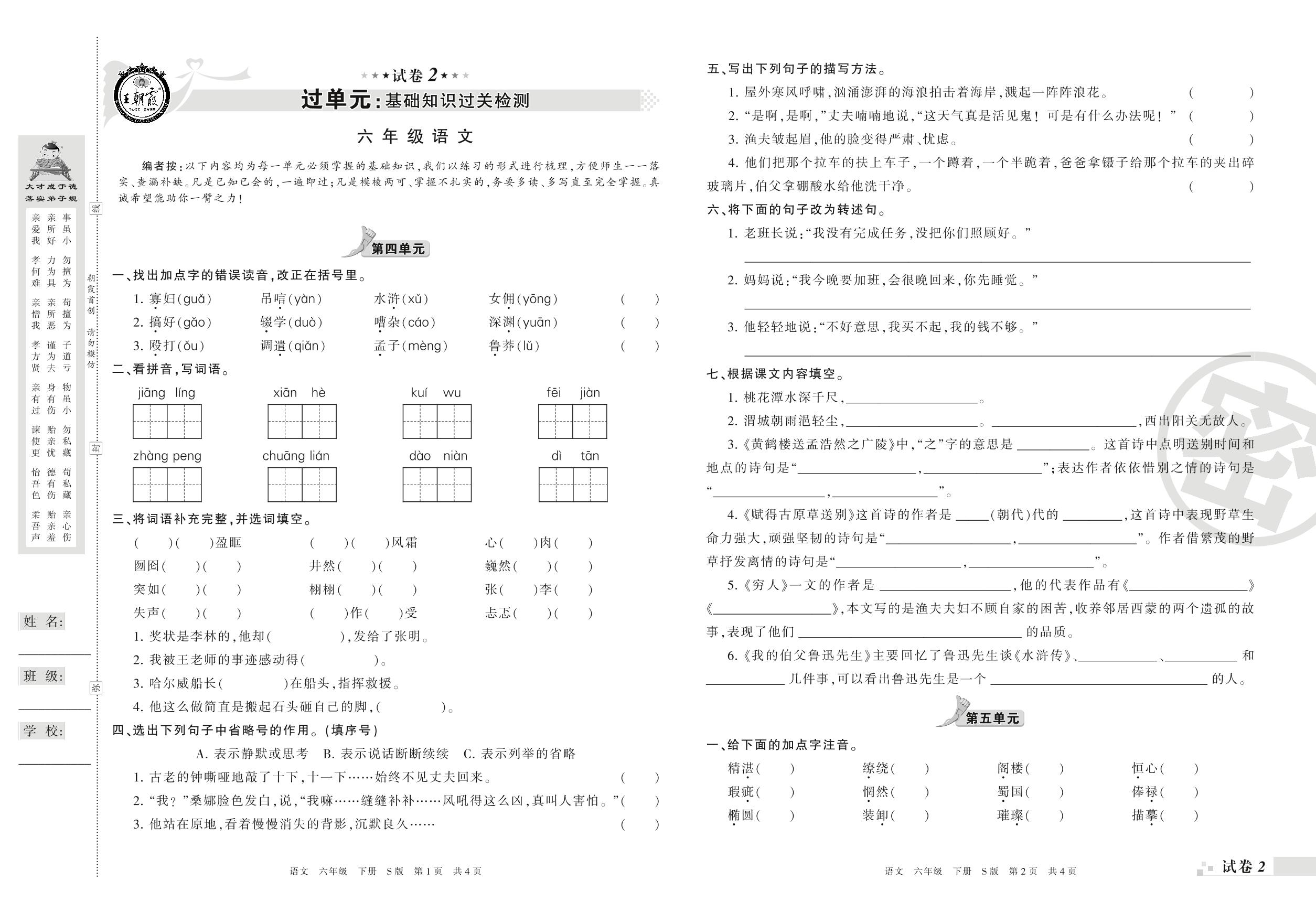 王朝霞期末过单元——基础知识过关检测六年级下册语文(S版)_R210802121328【2】