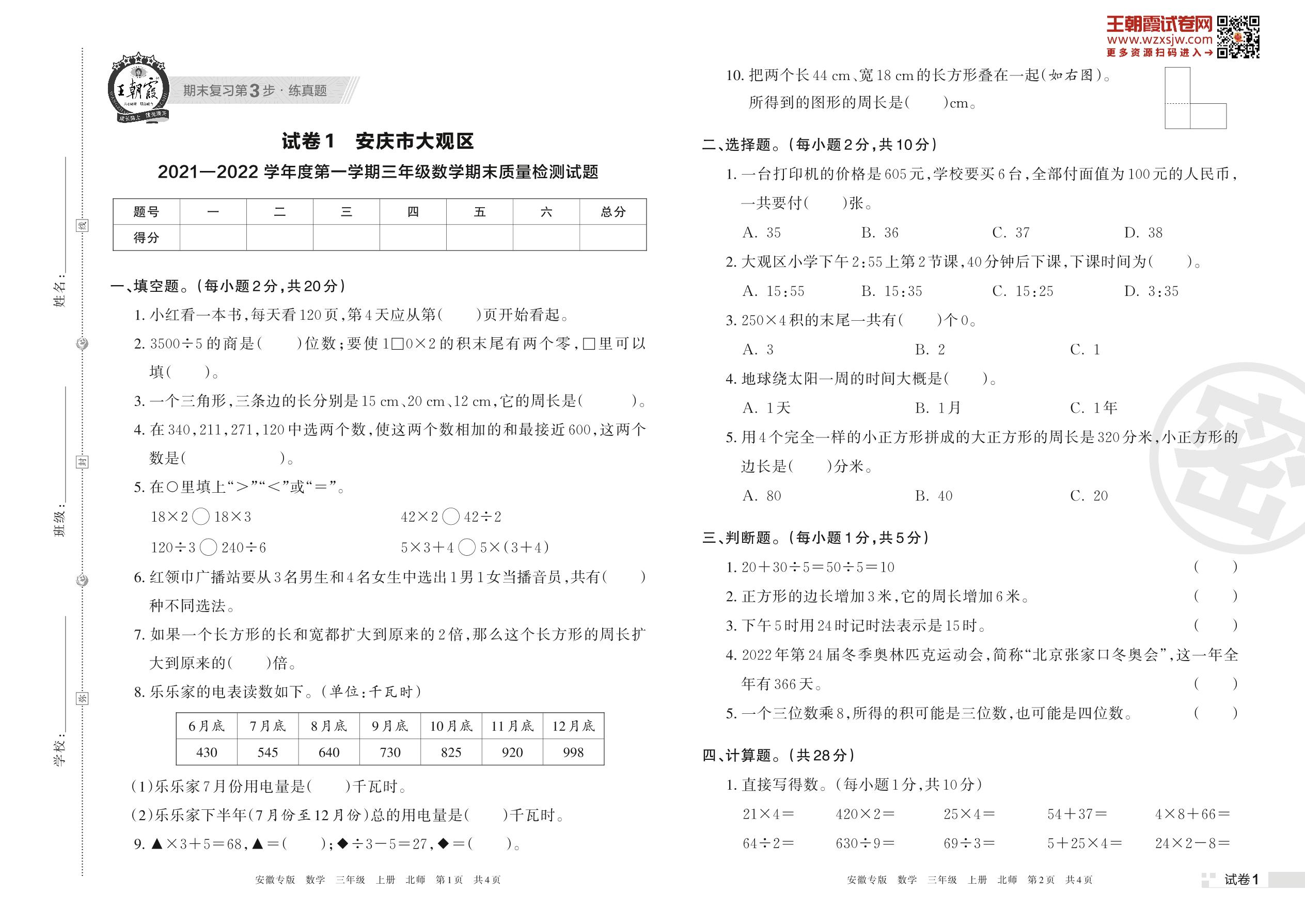 安庆市大观区2021—2022 学年度第一学期三年级数学期末质量检测试题(北师版)【1】