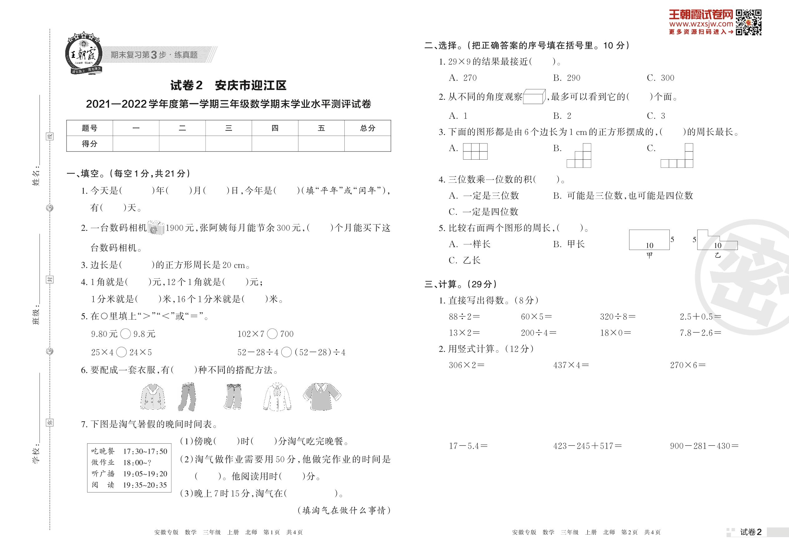 安庆市迎江区2021—2022学年度第一学期三年级数学期末学业水平测评试卷(北师版)【2】