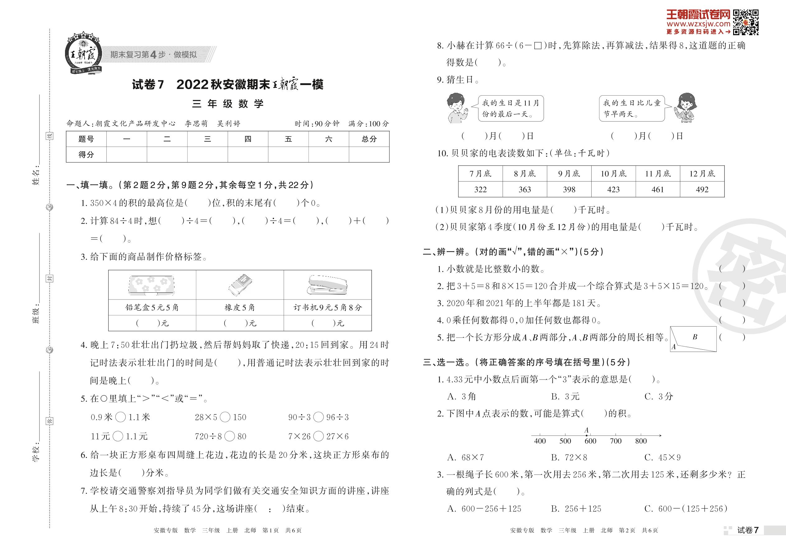 王朝霞期末模拟卷三年级上册数学(北师版)_R221126115428025【7】