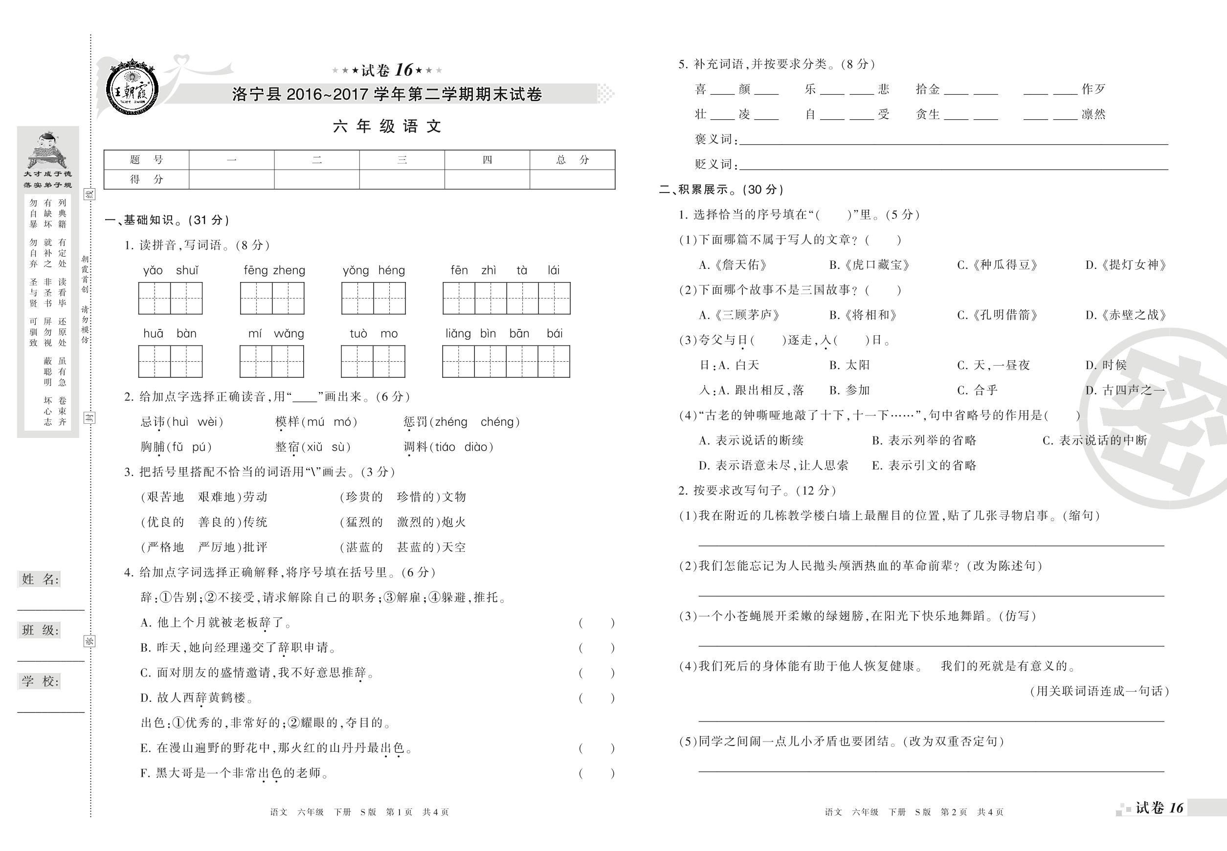 2016-2017学年第二学期洛阳市洛宁县六年级语文试卷(S版)【16】