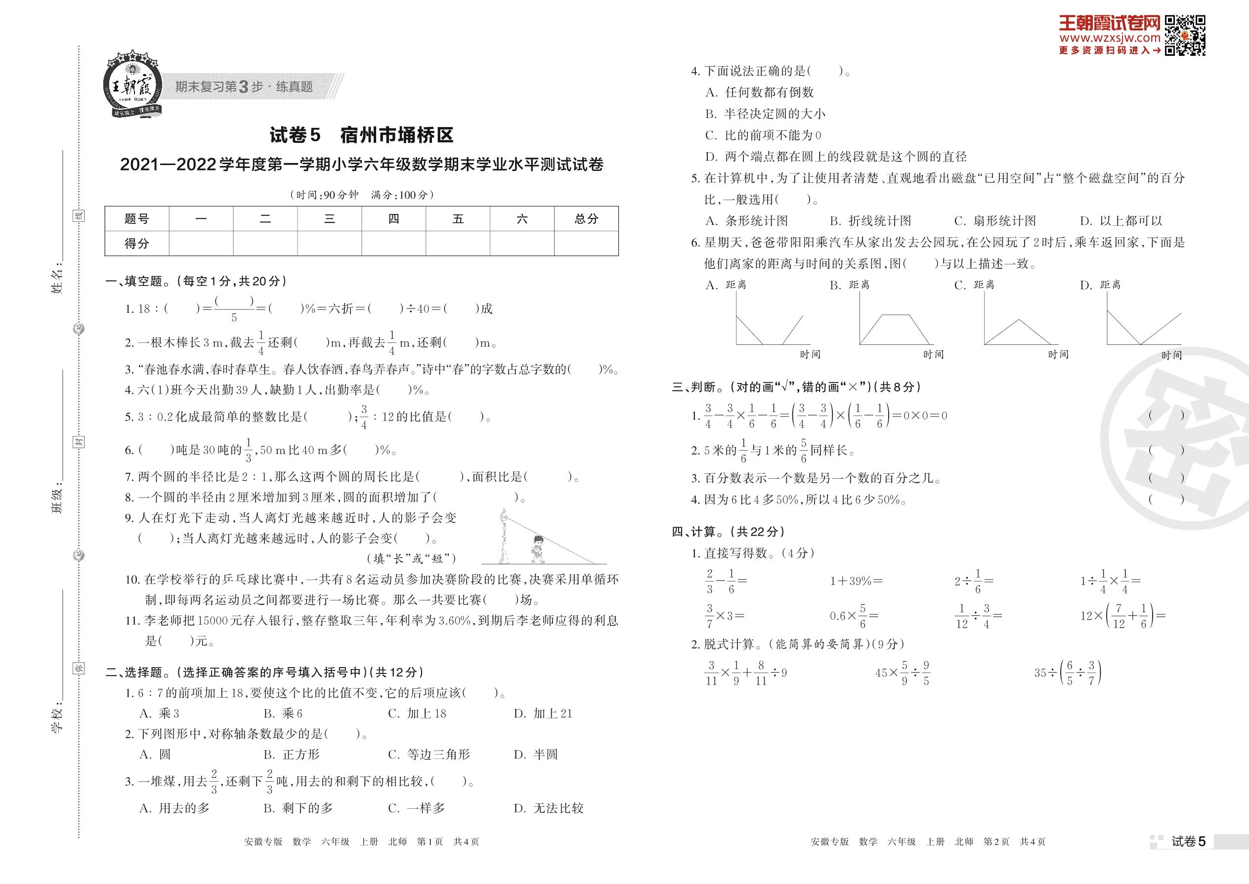 宿州市埇桥区2021—2022学年度第一学期小学六年级数学期末学业水平测试试卷(北师版)【5】