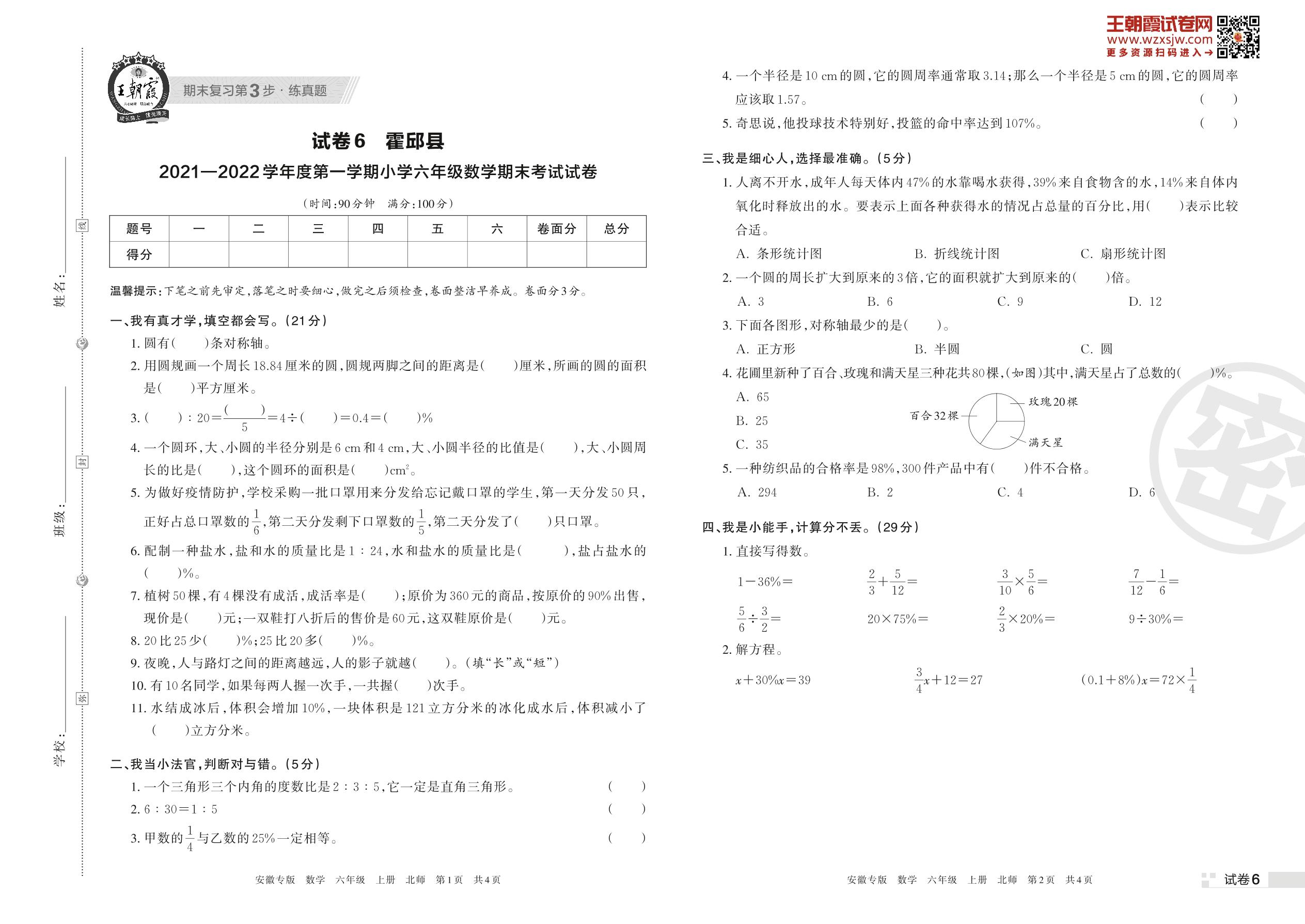 霍邱县2021—2022学年度第一学期小学六年级数学期末考试试卷 (北师版)【6】