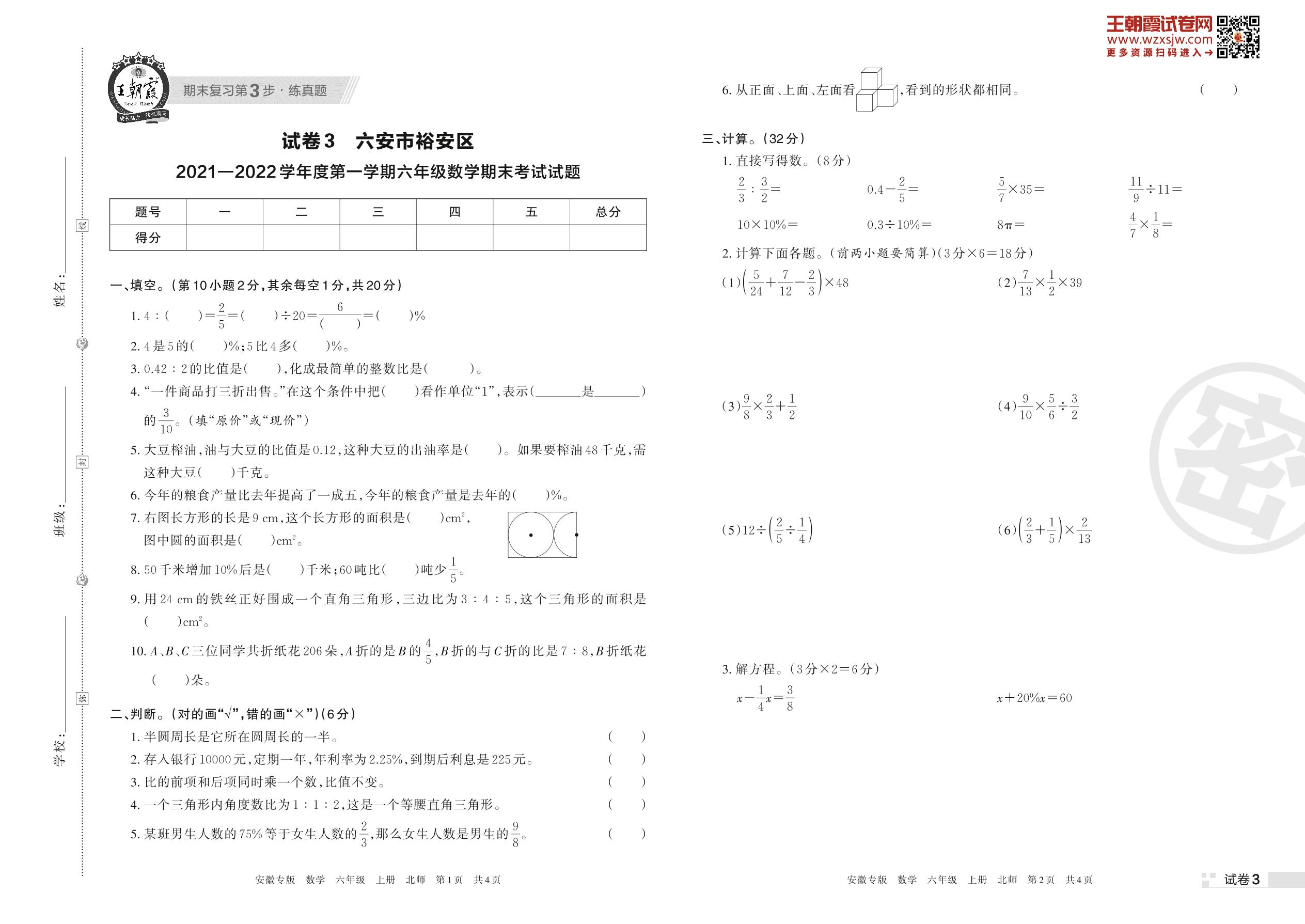 六安市裕安区2021—2022学年度第一学期六年级数学期末考试试题(北师版)【3】