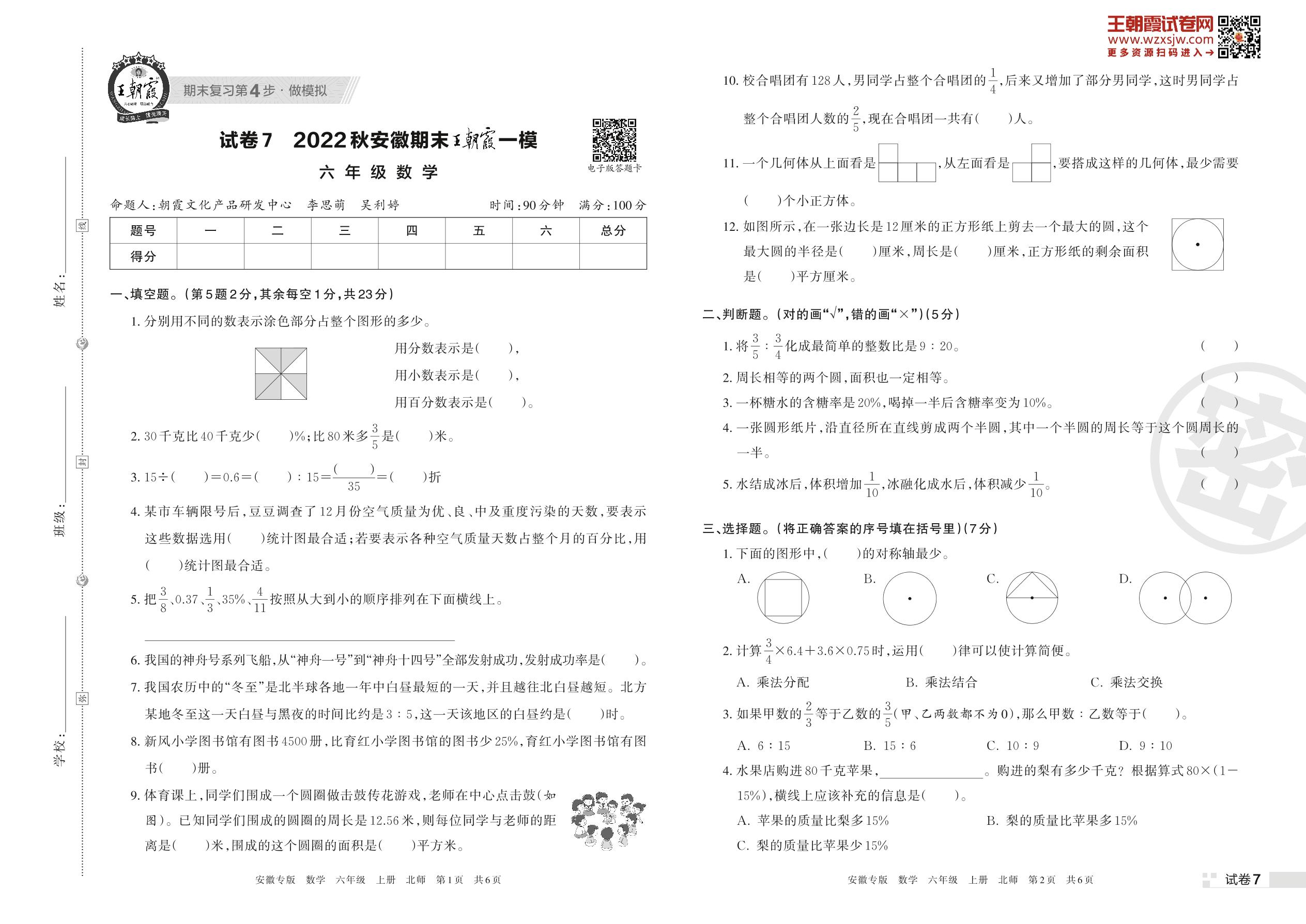 王朝霞期末模拟卷六年级上册数学(北师版)_R221126120511851【7】